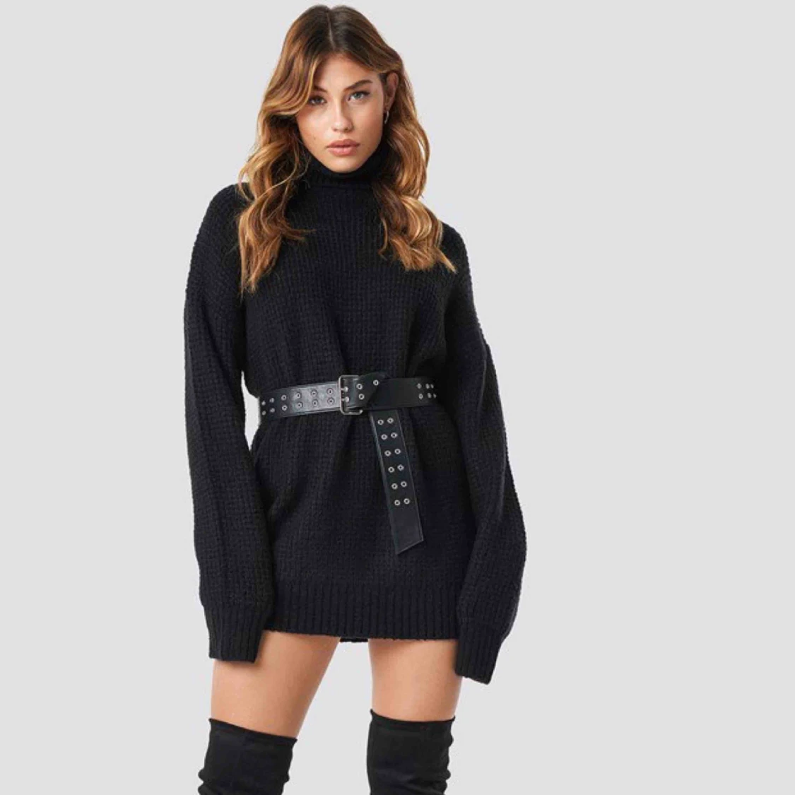 Svart stickad klänning, sjukt snygg men jag har inte fått någon användning av den därför är den helt oanvänd med prislappar kvar. Passar xxs-s.