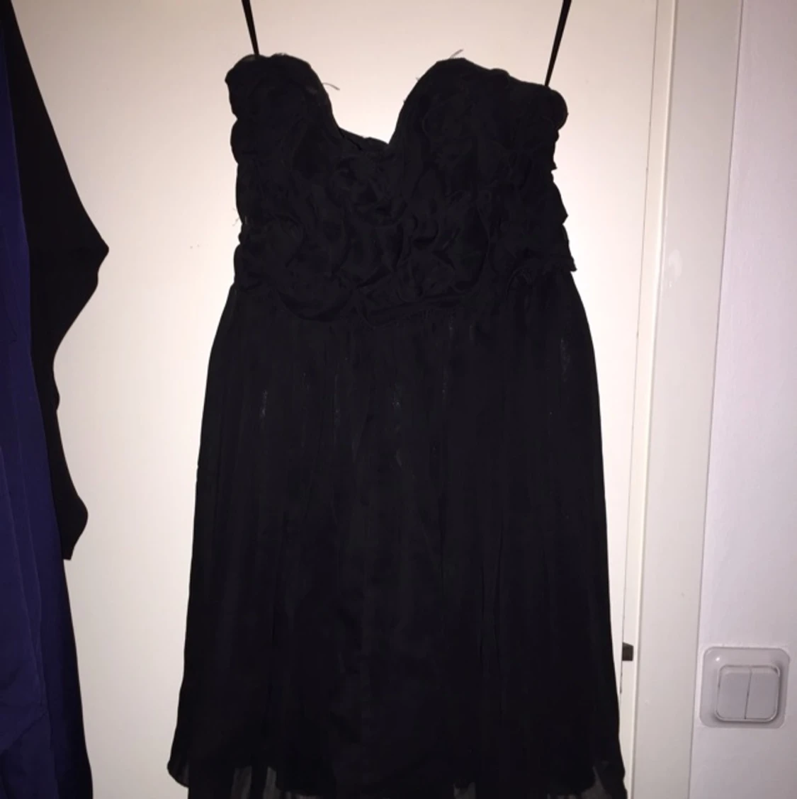Ärmlös klänning, svart. Med blommigtmotiv övertill - se bild 2. Ganska kort Siden tyg med transparent tyg ovanför.