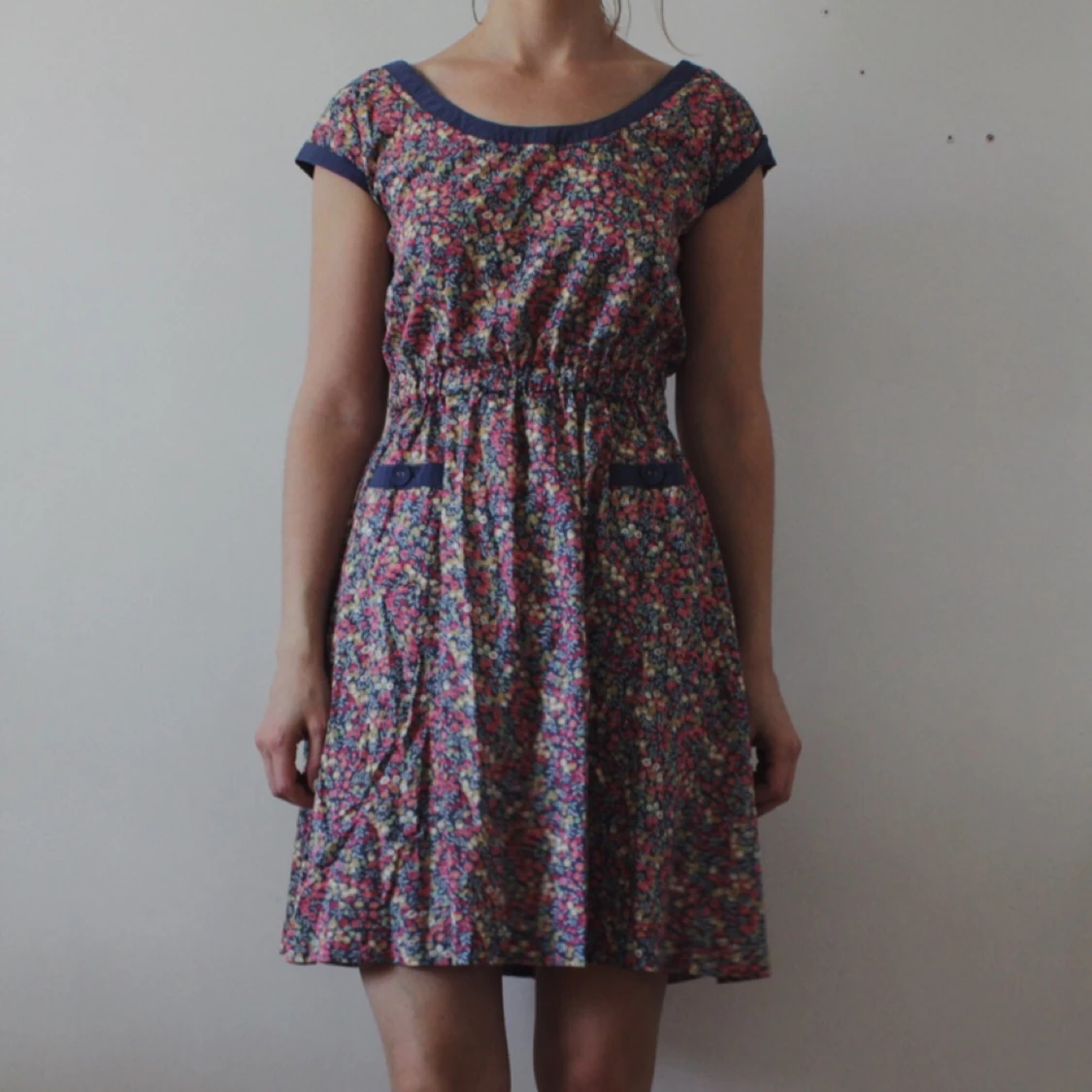 Sommarklänning från Rules by Mary. Fin rygg med knappdetalj hela vägen. Töjbar resår i midjan. Ytterligare detalj med två fickor fram.