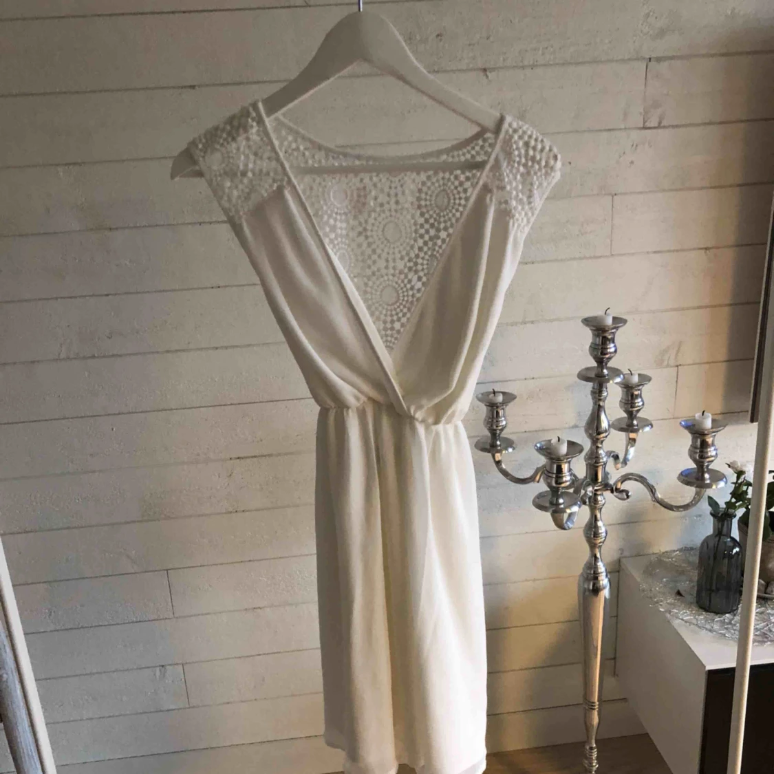Vit spetsklänning med volangärmar - Superfin vit kortklänning i spets med blommigt mönster och volangiga axelband. Klänningen har en luftig och loose passform, perfekt för varma dagar. Söt och romantisk stil med v-ringning och detaljerade kanter. Ingen synlig dragkedja eller knappar.