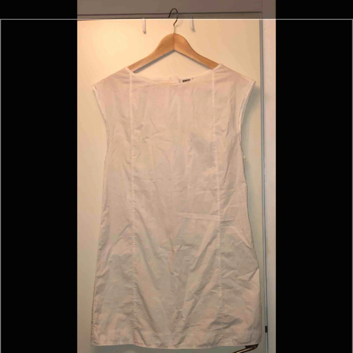 Somrig vit klänning i ”skjort-material”. Tunn, lätt, skön, hänger rakt på kroppen.
