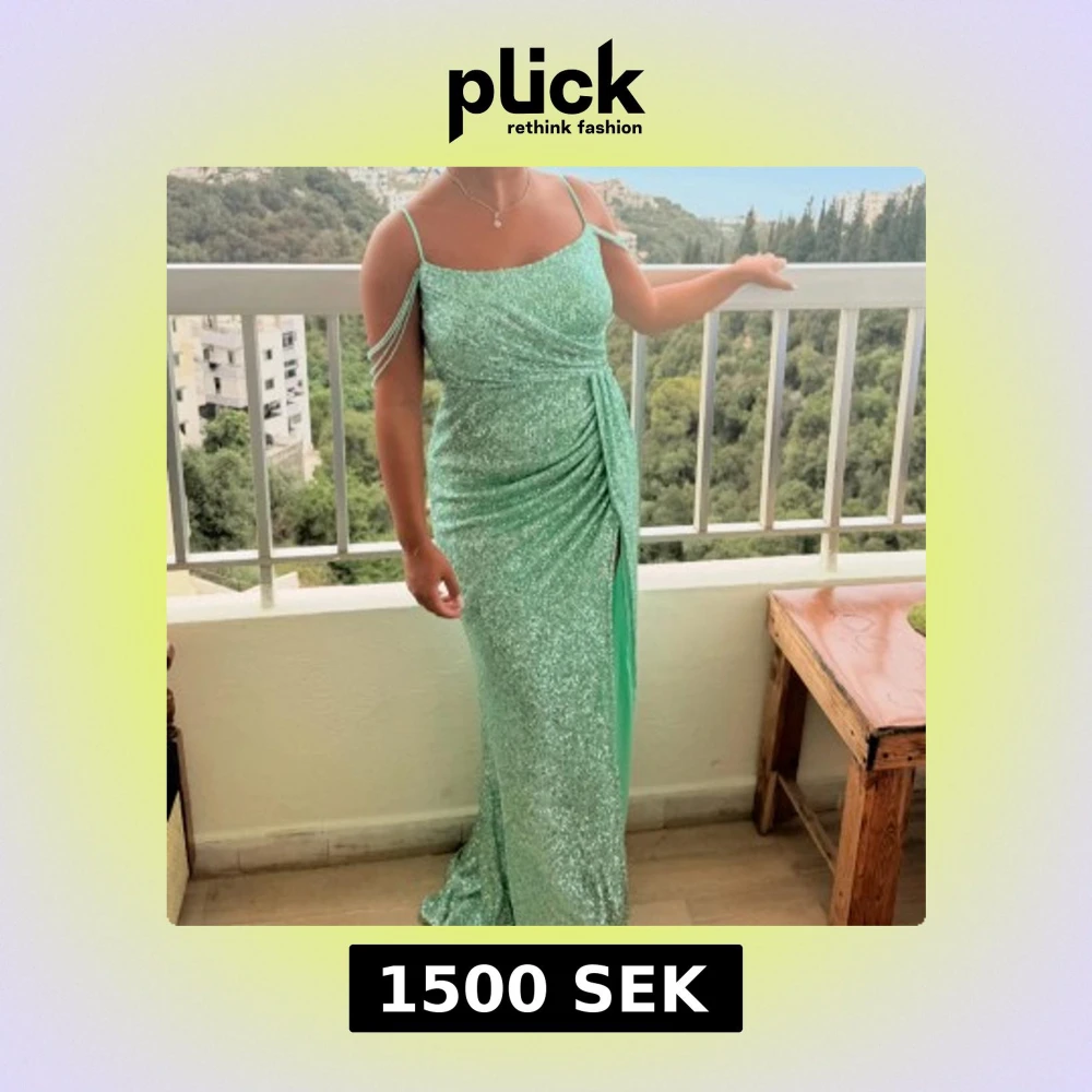 Säljer en mintgrön långklänning med glittrigt tyg och smala axelband. Klänningen har dekorativa pärlband över axlarna, drapering i midjan och en hög slits framtill. Perfekt för bal eller festliga tillfällen när du vill sticka ut. Klänningen är kemtvättad!