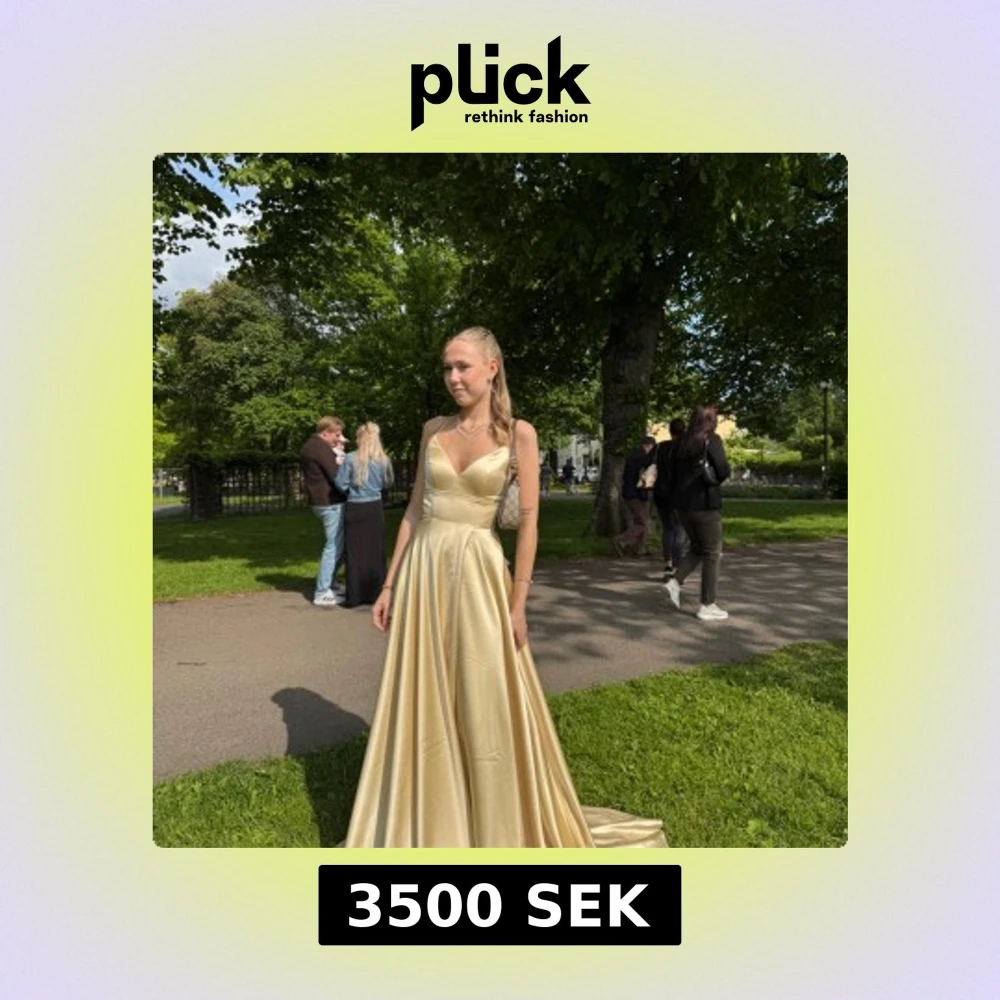 Originalpris 5500 kr. Säljer en elegant långklänning i champagnefärgad satin med smala axelband och öppen rygg med snörning. Klänningen har v-ringad urringning och ett svepande, glansigt tyg som ger en lyxig känsla. Perfekt för bal eller student!