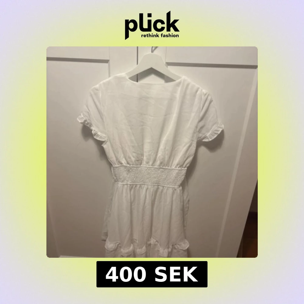 Supersöt vit kortklänning från Dressy med omlott och knyt framtill, smockad midja och volangdetaljer vid ärmslut och kjolkant. Perfekt för sommarens alla tillfällen och ger en fräsch och romantisk vibe.