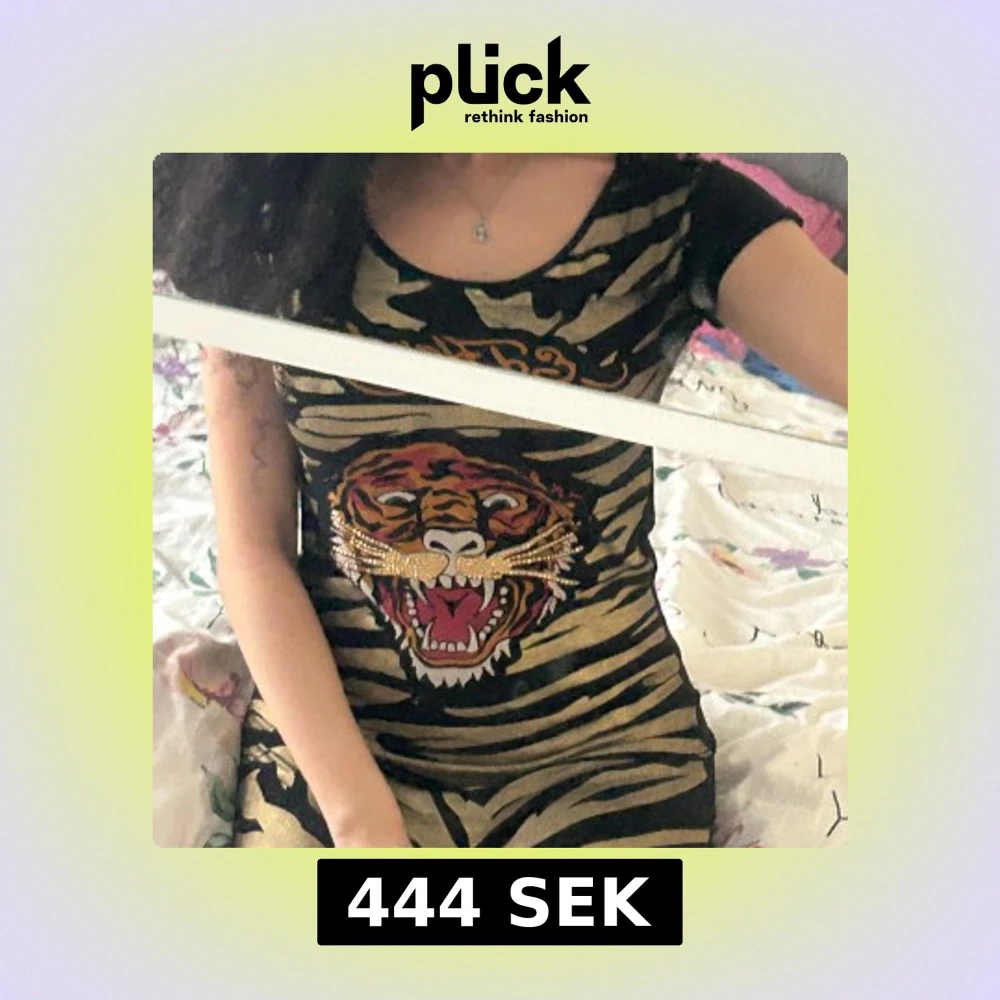 Ed hardy t-shirt som kan användas som en mini dress. Skit fin its giving vintage. Guldiga zebraränder och stort tigertryck framtill, rhinestones på tröjan. Tight passform och korta ärmar. Ed hardy on the back