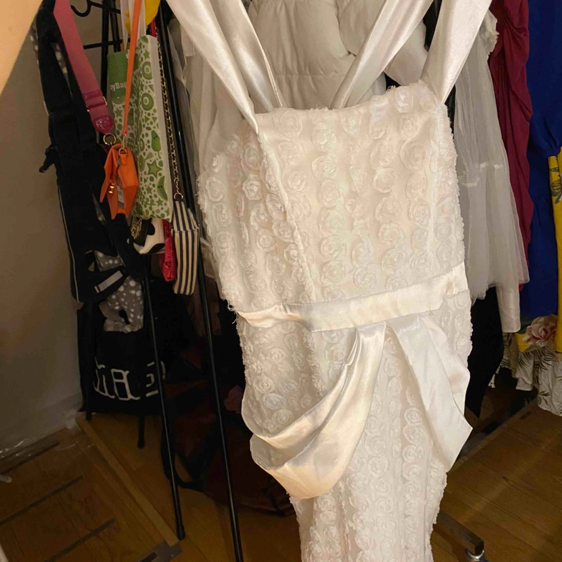 En vit klänning som är hand sytt. Aldrig använd i storlek xs passar även liten S . Har fått liten barn så vill inte bara hänga där .