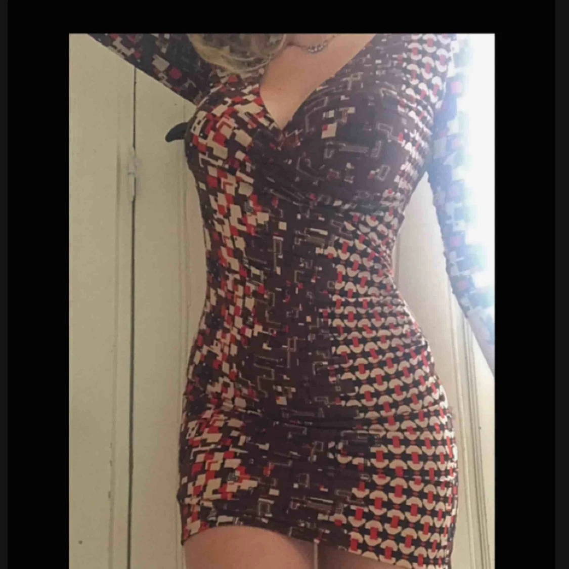 Kroppstight stretchig klänning med fyrkantiga mönster i brun, röd, vit och svart🧚♀️ Använd ett fåtal gånger!