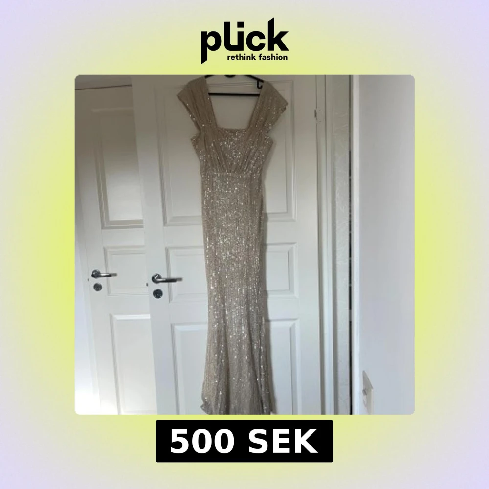 Elegant champagnefärgad långklänning med glittrande paljetter. Perfekt för bal, bröllop eller andra festliga tillfällen 🤩