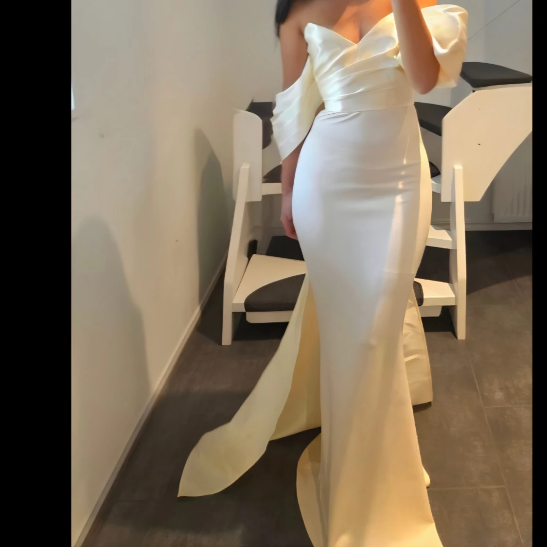 Säljer en elegant champagnefärgad långklänning med offshoulder och draperad överdel. Klänningen har en figurnära passform, v-ringad urringning och ett långt släp baktill. Materialet är glansigt och känns lyxigt, perfekt för bal eller fest. Snygga detaljer vid axlarna och ryggen.