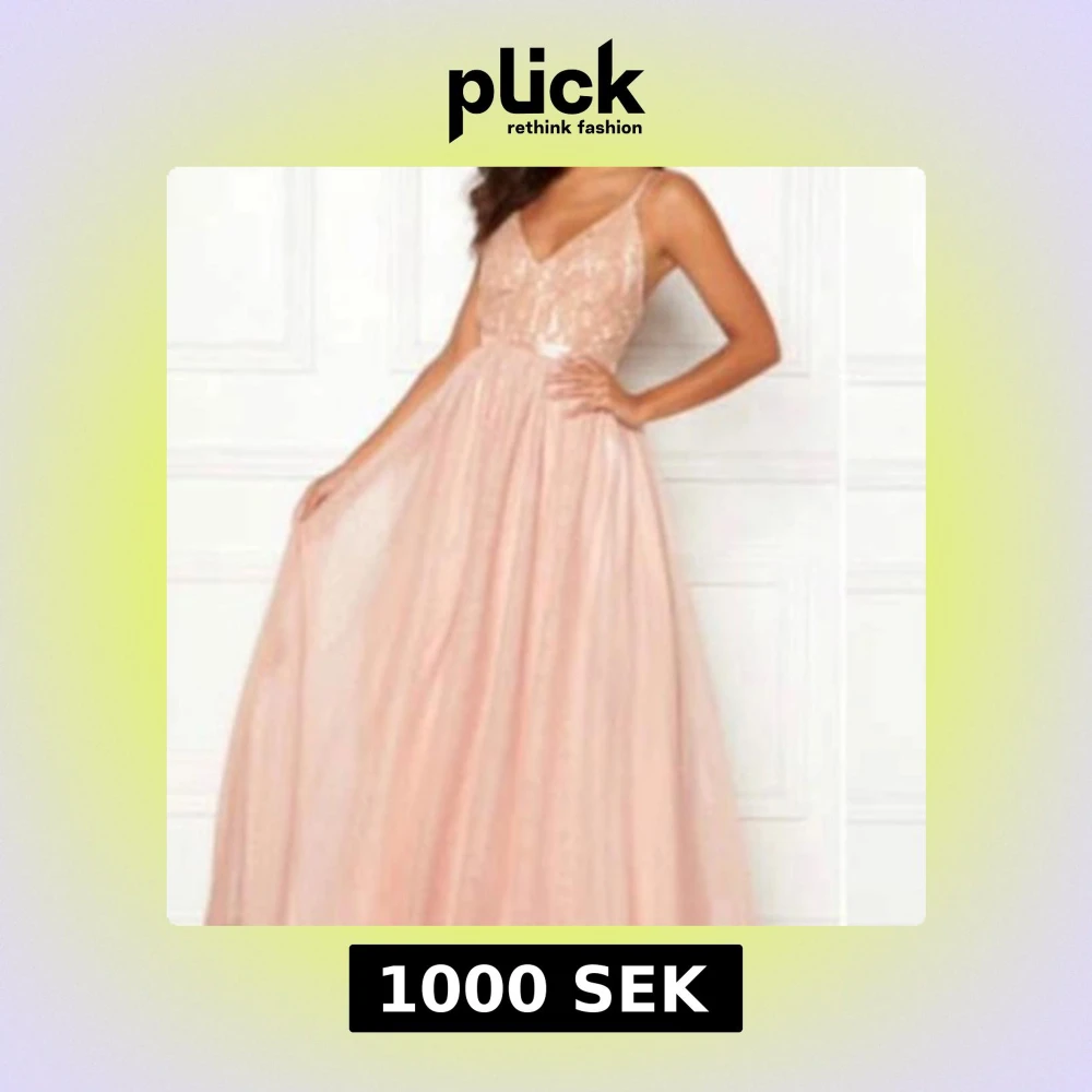 Elegant ljusrosa långklänning med spetsdetaljer och öppen rygg. Klänningen har smala axelband och en v-ringad urringning. Perfekt för speciella tillfällen. Denna klänning är endast använd 1 gång och bedöms därav i mycket fint skick.