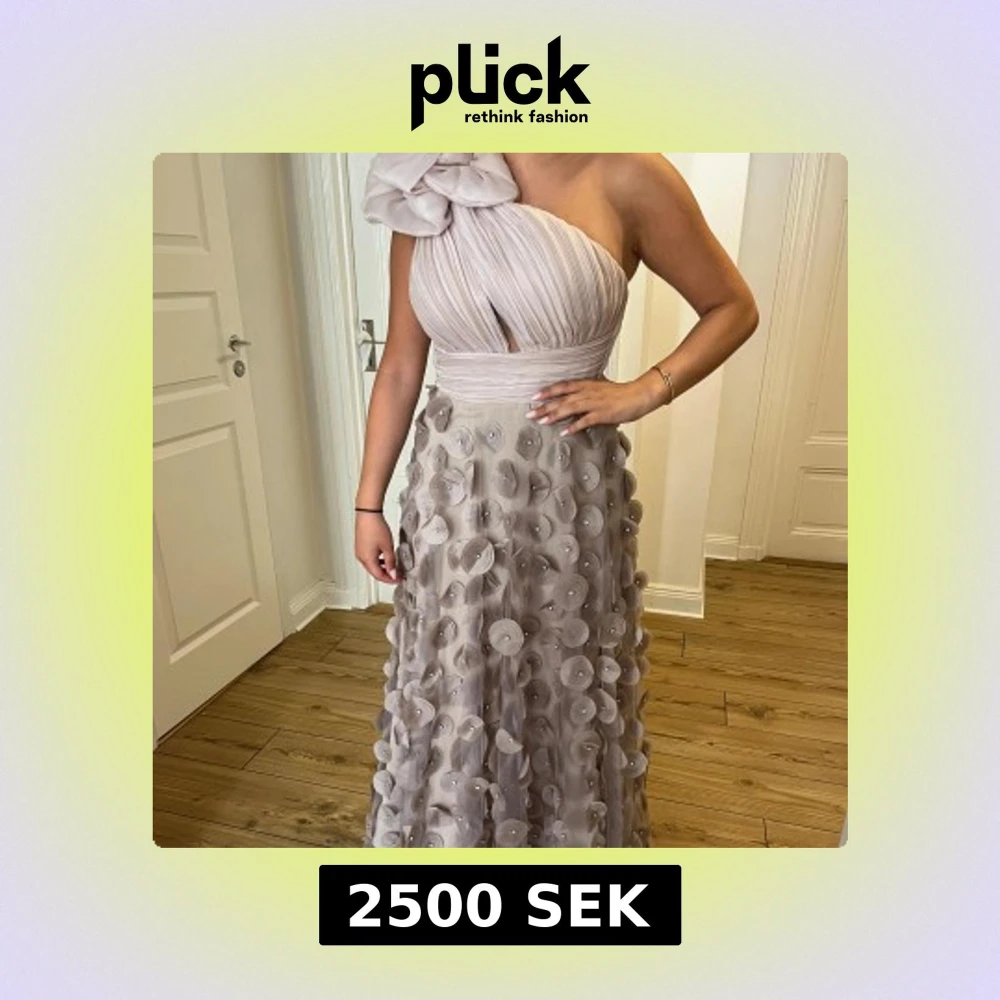 Säljer en elegant långklänning i ljus champagnefärg med en axel och stor volangdetalj upptill. Kjolen är täckt av 3D-blommor och pärlor för en unik look. Perfekt för bal eller fest! Materialet känns lyxigt och klänningen har oneshoulder-modell. Nypriset är 4000kr
