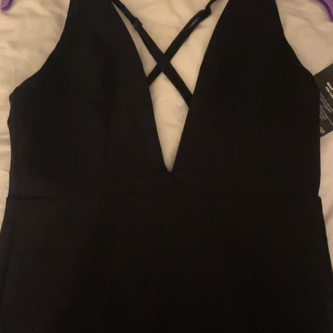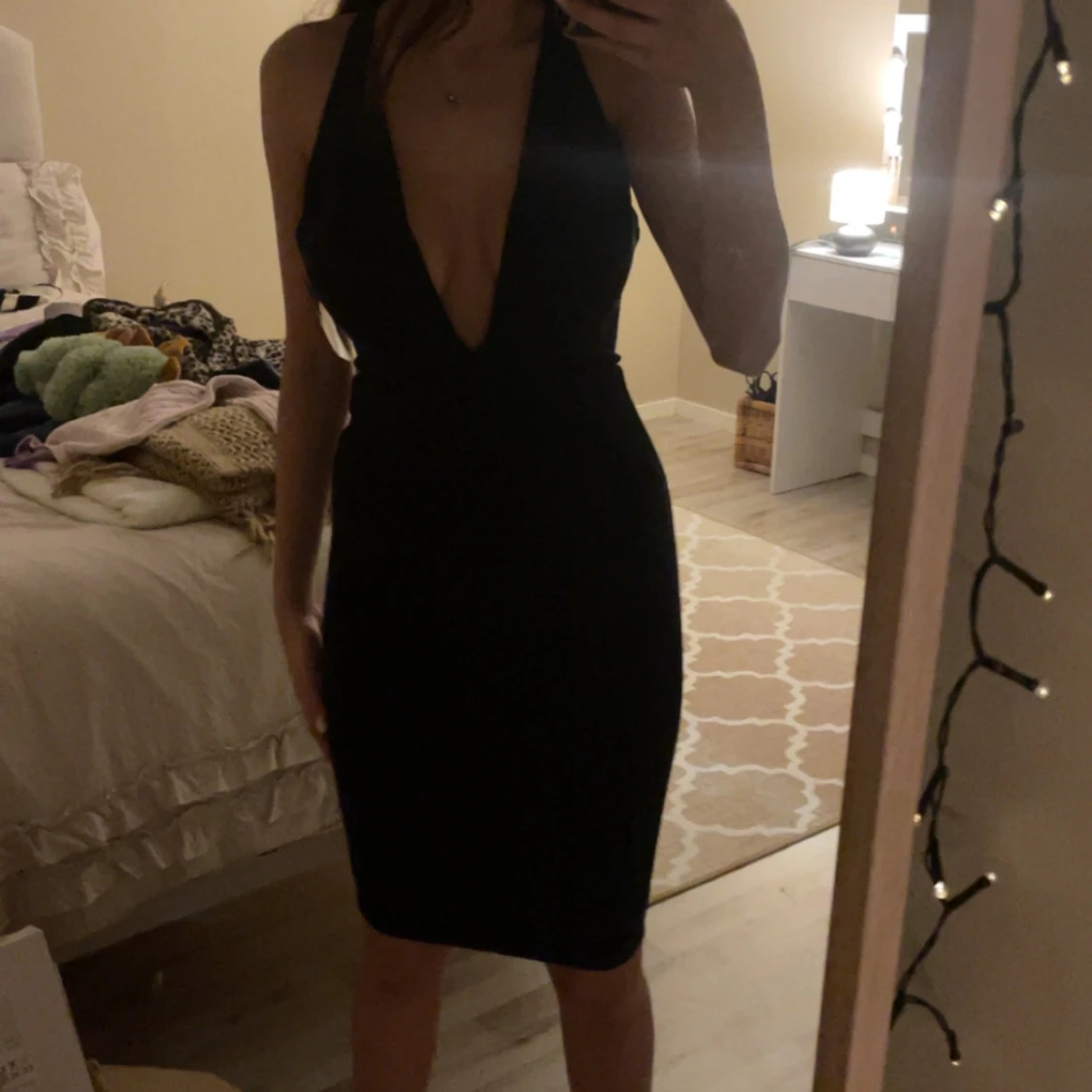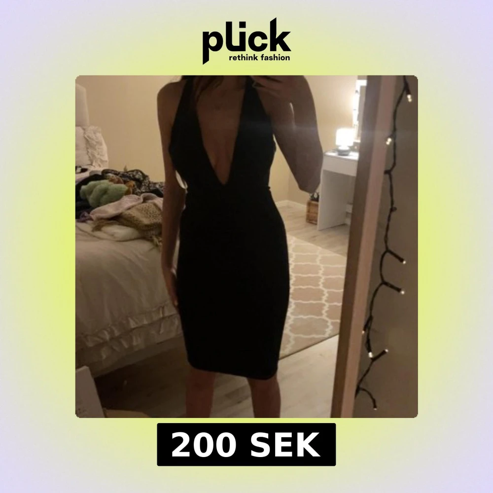 Elegant svart klänning med djup v-ringning och korsade band i ryggen. Perfekt för en stilren look och black tie