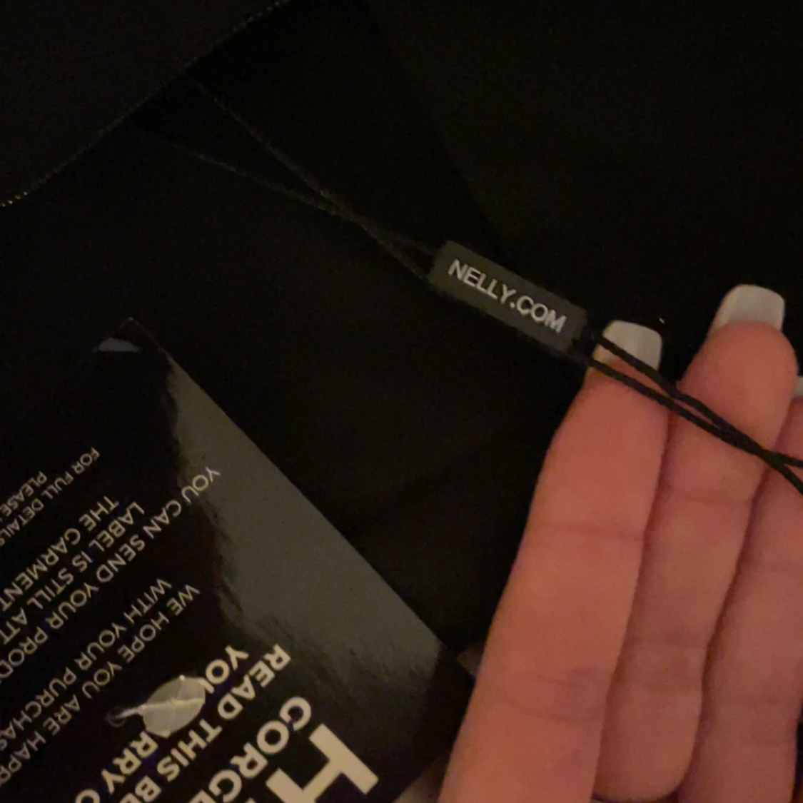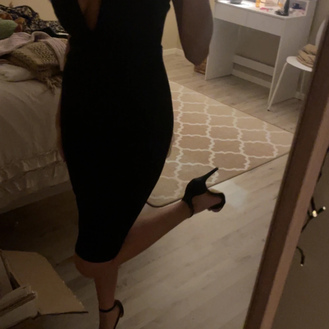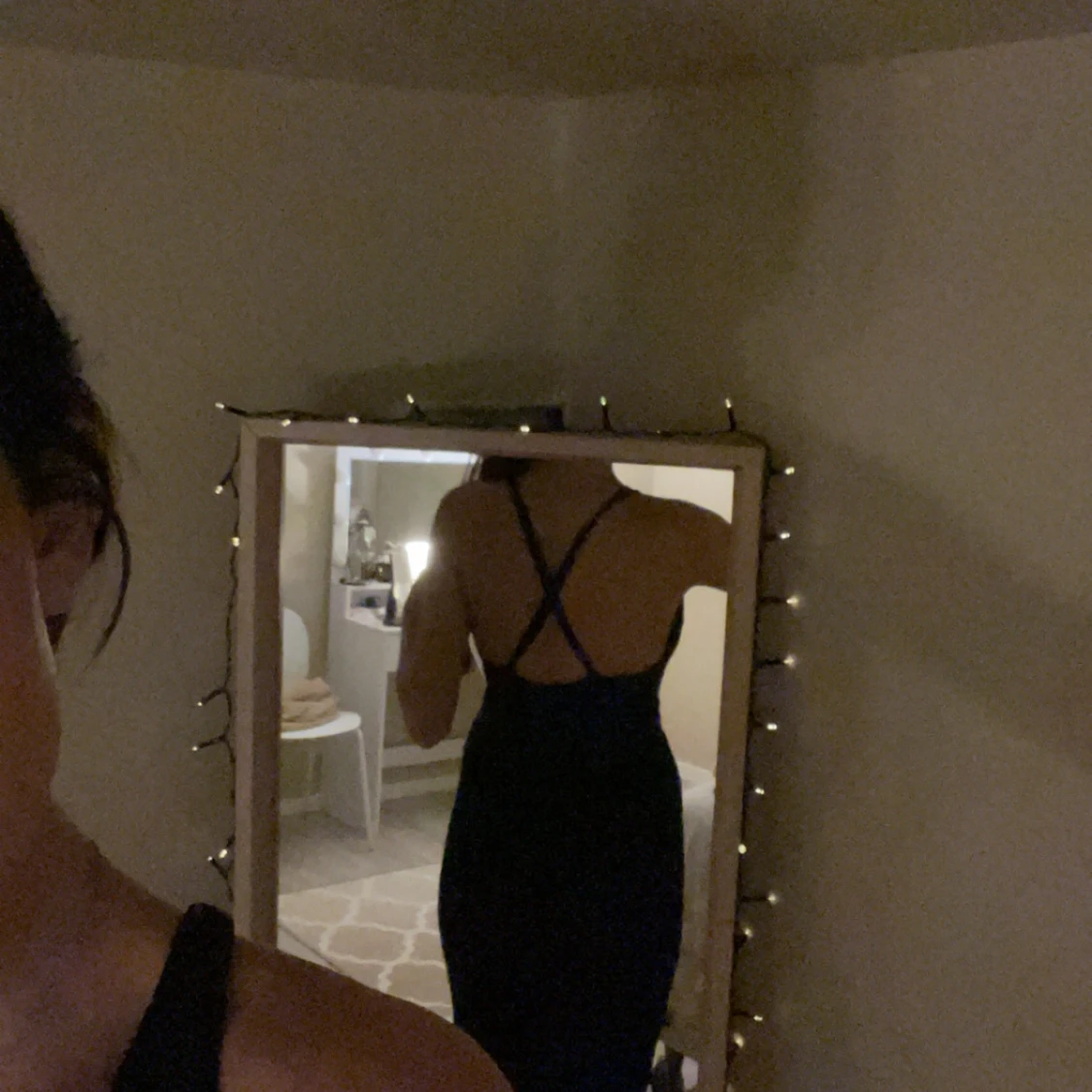 Elegant svart klänning med djup v-ringning och korsade band i ryggen. Perfekt för en stilren look och black tie