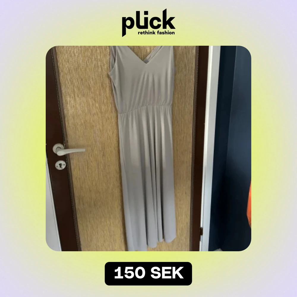 Säljer en elegant grå långklänning. Klänningen har en v-ringad hals och är ärmlös med smala axelband. Perfekt för festliga tillfällen eller en sommarkväll. Klänningen är i nyskick och har en normal passform.