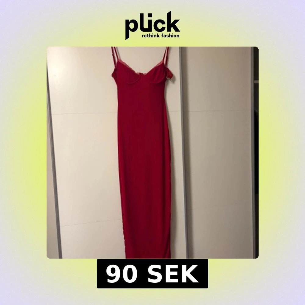 Röd långklänning med smala axelband och spetskant vid bysten. Klänningen har figurnära passform, markerad byst och en snygg slits baktill. Materialet är mjukt och stretchigt, perfekt för en statement-look.
