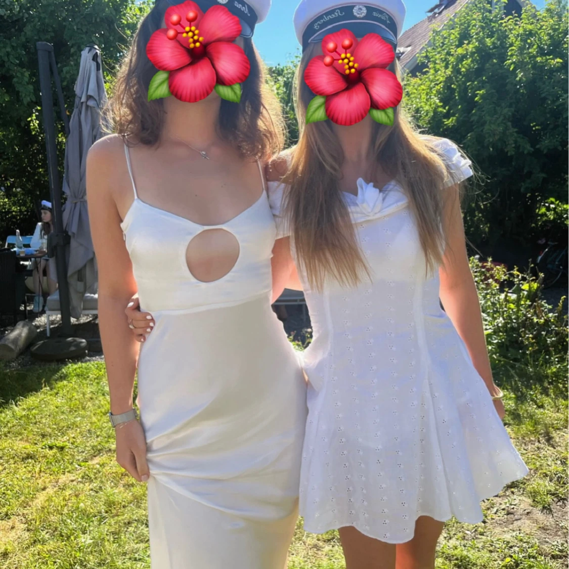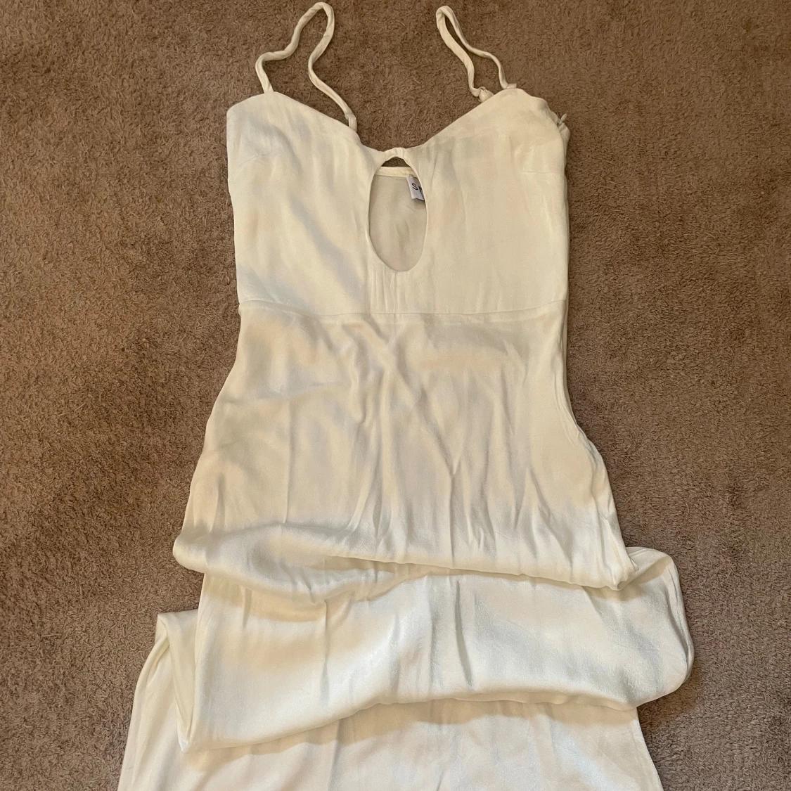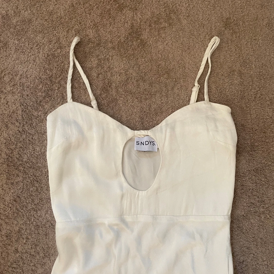 Supersnygg vit långklänning från SNDYS med tunna axelband och en rund cut out-detalj framtill. Klänningen har en slimmad passform och är gjord i ett glansigt material som ger en lyxig känsla. Perfekt för student eller sommarens alla tillfällen!
