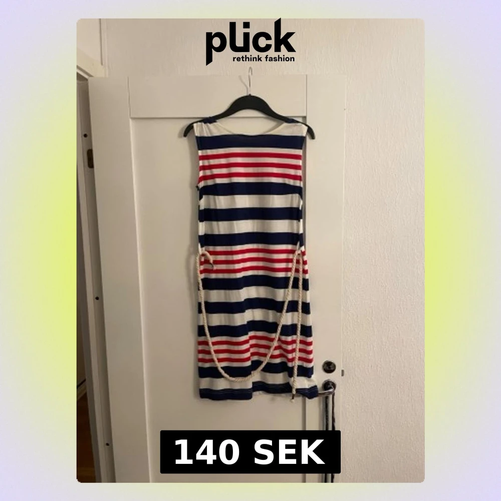 Säljer en ärmlös klänning från Ellos med breda horisontella ränder i marinblått, rött och vitt. Klänningen har en kort längd och ett rep som bälte i midjan för extra detalj. Perfekt för varma dagar och har en mjuk bomullskänsla.