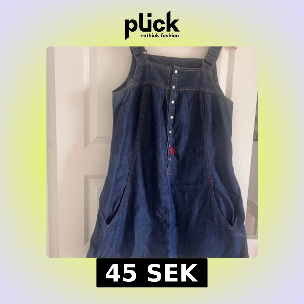Snygg jeansklänning från Ellos Plus Collection i 100% bomull. Mörkblå denim, breda axelband med spännen och knappar framtill. Praktiska fickor och kontrastsömmar ger en cool vibe. Perfekt för dig som gillar avslappnad stil med edge.