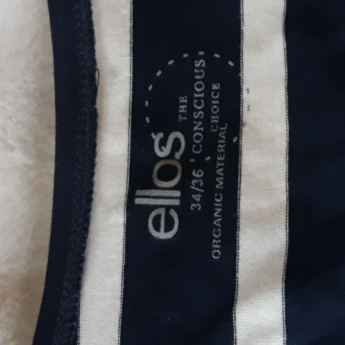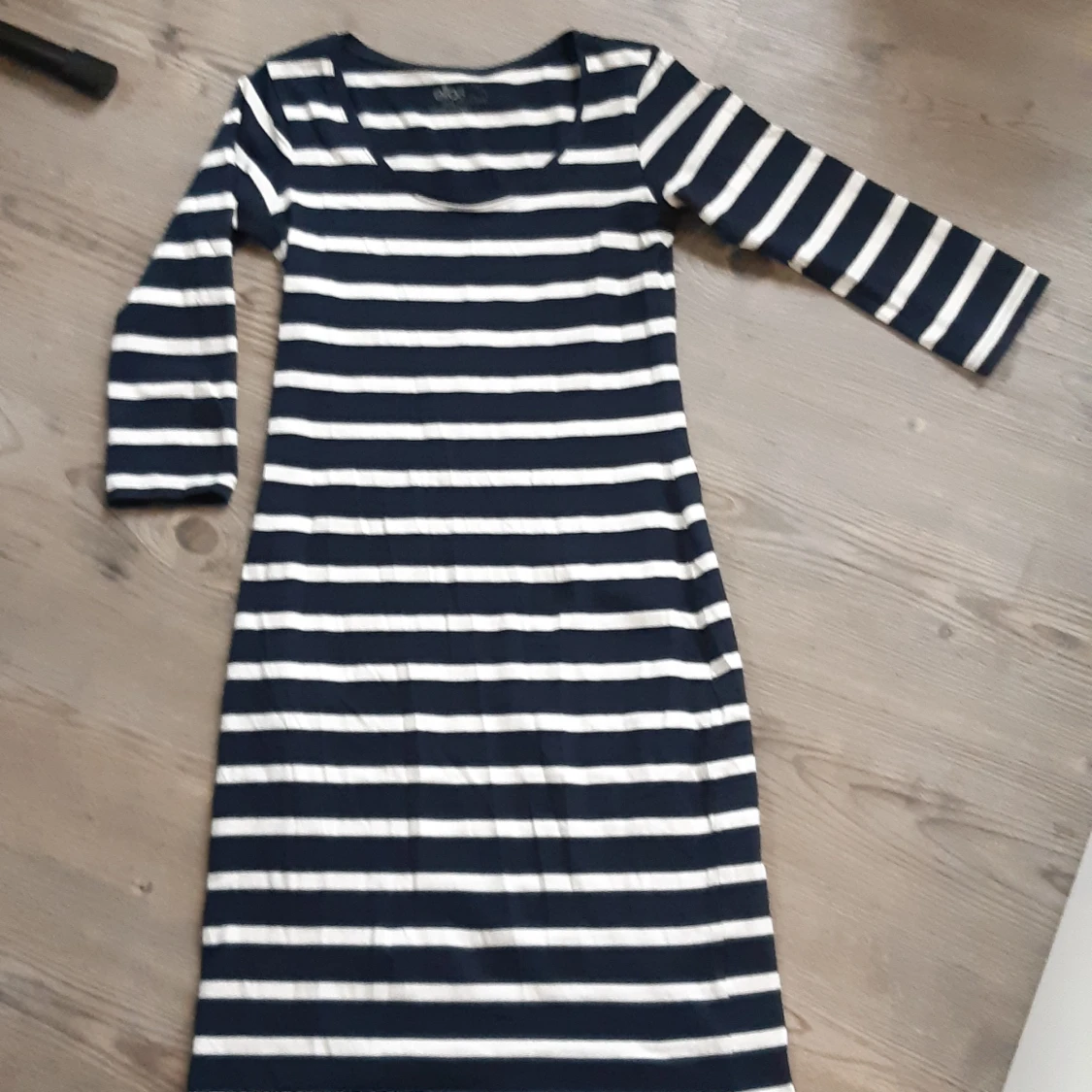 Marinblå klänning med vita ränder och 3/4 ärmar. Den är Strl 34/36 men den passar om man brukar ha lite större storlek. Aldrig använd.