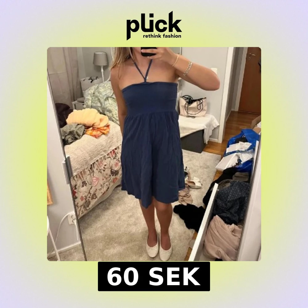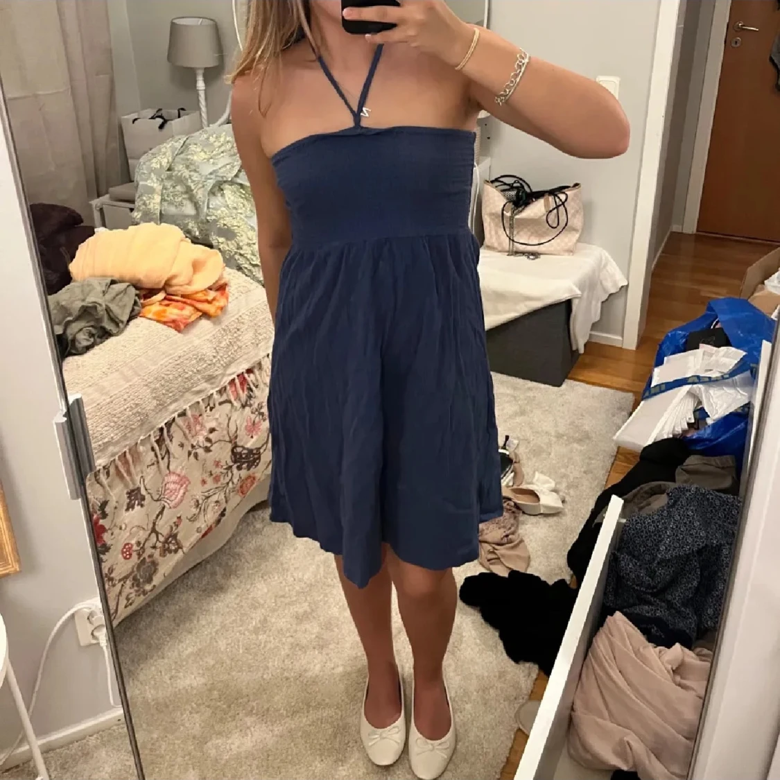 Supersöt mörkblå kortklänning från ellos med halterneck och smockad överdel. köp flera plagg i bundles för ett billigare pris!❤️