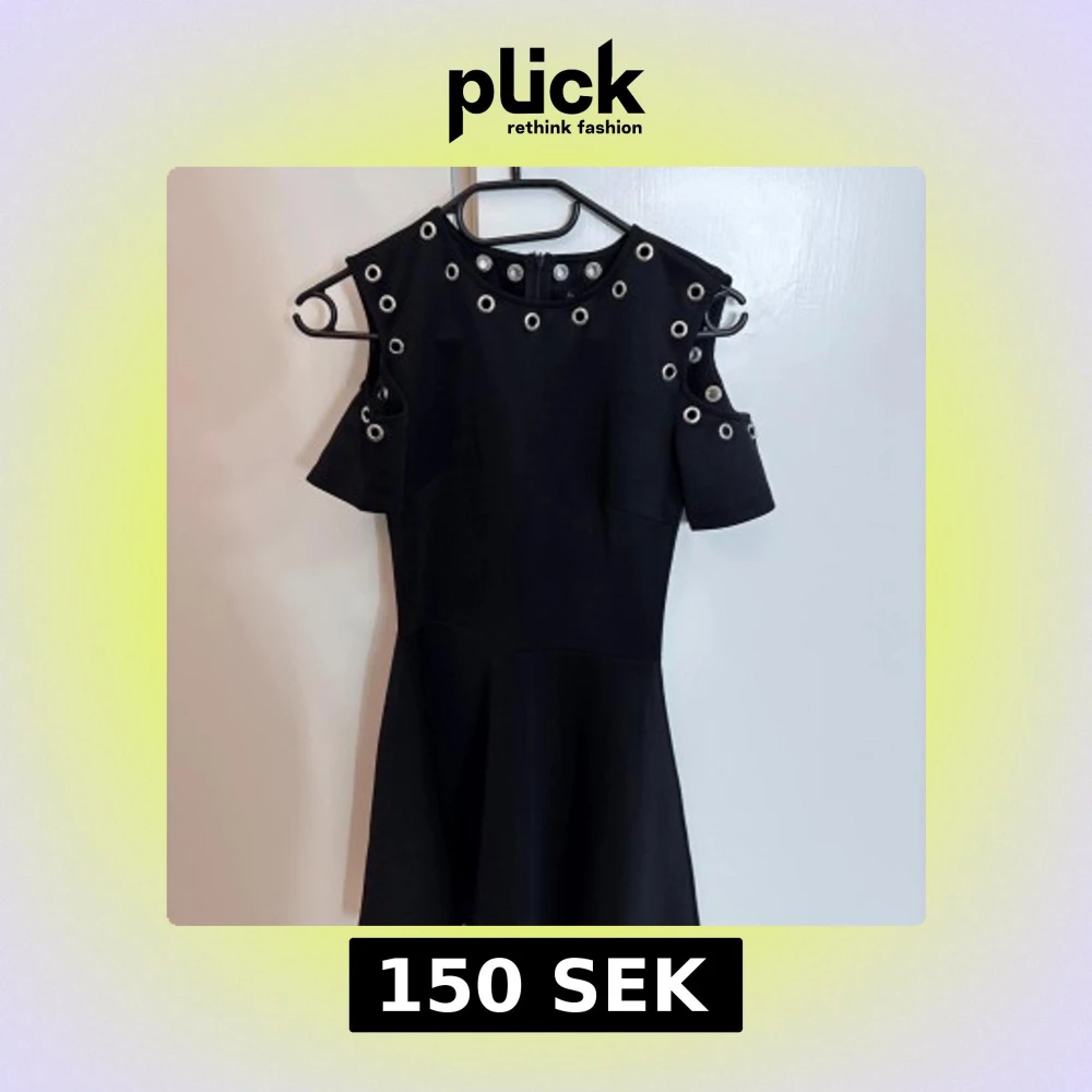 Snygg svart klänning med coola nitar runt halsen och ärmarna. Klänningen har en modern offshoulder-design och korta ärmar. Perfekt för en kväll ute eller en speciell tillställning.
