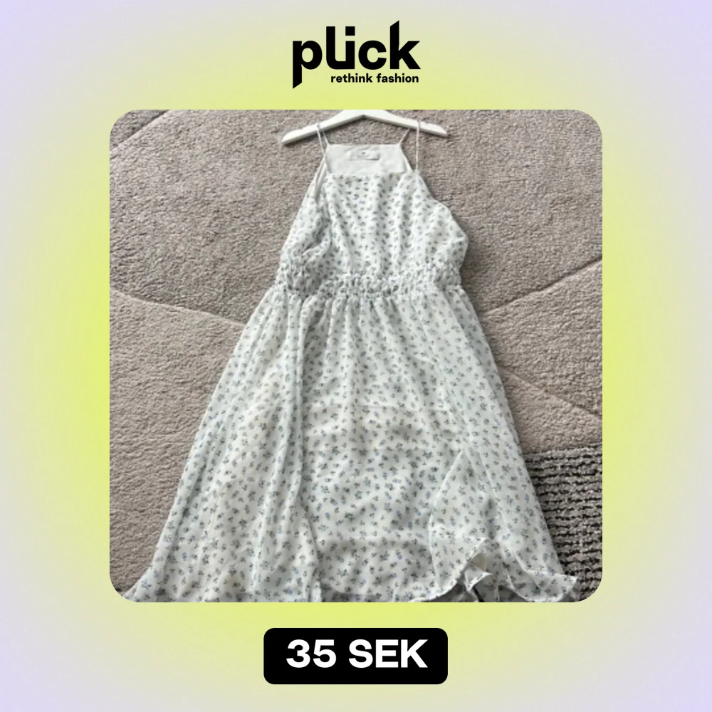 Den är 90 cm lång och är 35 cm bred. En lång sommarklänning i färgen vit med blå roser. Den är jätte bra skick