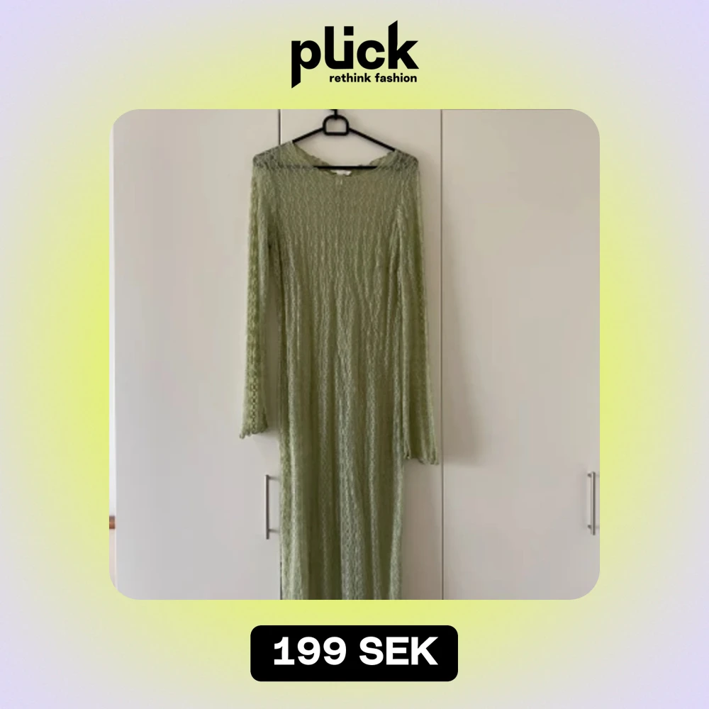 En ljusgrön figurnära klänning i tunn spets. Den är vadlång och har overlockade kanter med utställda ärmslut. Har bara testats!
