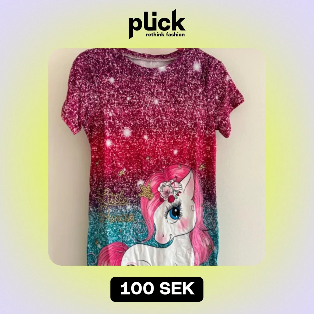 Klänning för 4-5 åring men motiv enhörning. Bra omhändertagen. Skönt material.
