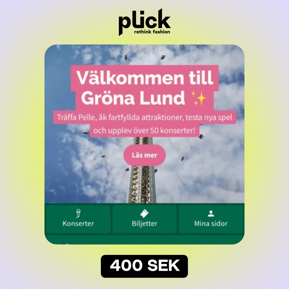 Har 5 entrébiljetter till Gröna lund den 27/7 Parken är öppet 11.00-22.00 Vuxna eller barn mellan 6-64år Värde upp till 595kr Biljetterna skickas efter avslutat annons till email sms eller per post. Meddela mig efter dit köp.