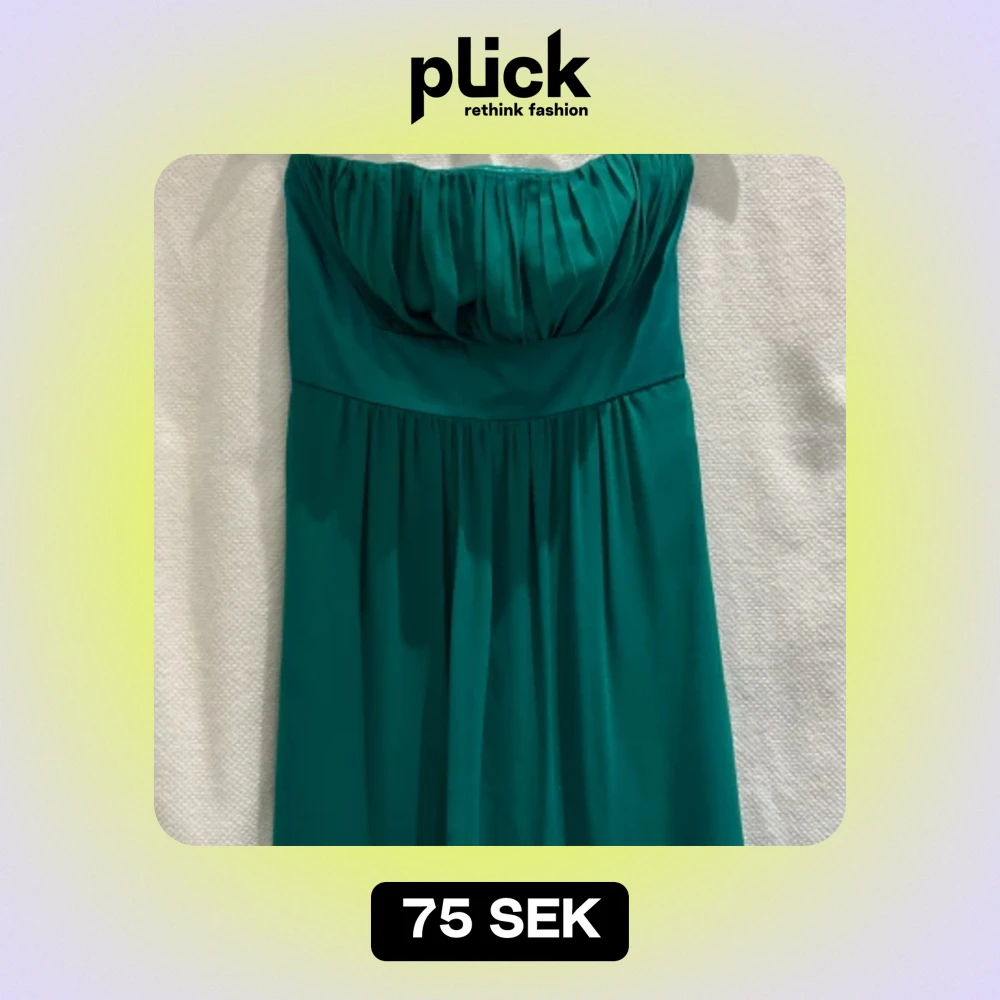 Fin grön klänning från Esprit. Axelbandslös, går att sätta på band (se bilder). I två lager. Litet märke/förslitning längs sömmen på ena sidan, enligt bild. Lite mörkare grön i verkligheten än på bilderna. Strl: S