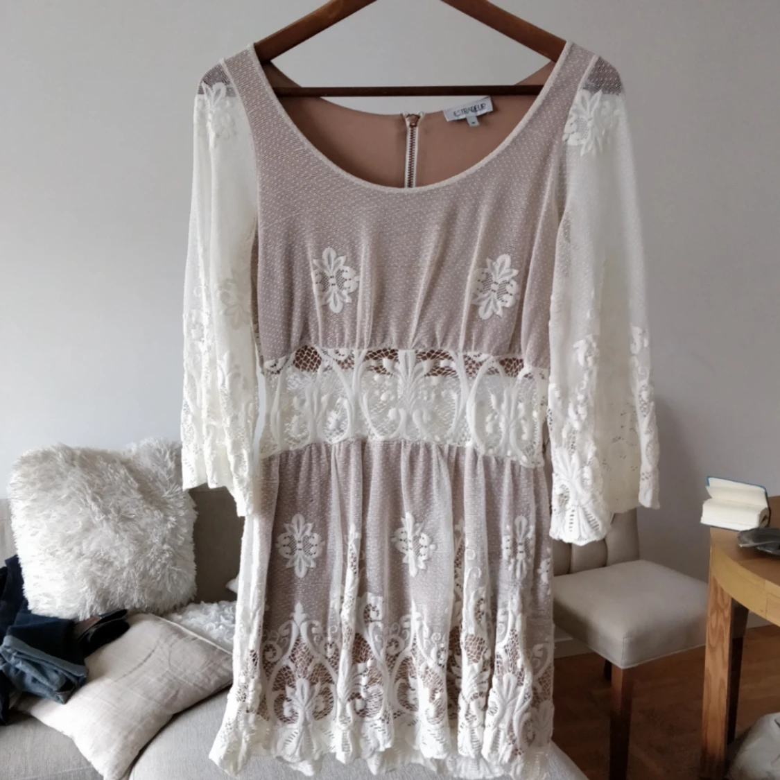 Fantastisk klänning från Estradeur. Storlek M men beroende på midja kanske den passar S bättre. Kan skicka mått om det är intressant. Underklänning finns så den är inte genomskinlig (förutom vid midjan, ca 12 cm typ). Skriv vid frågor! :)