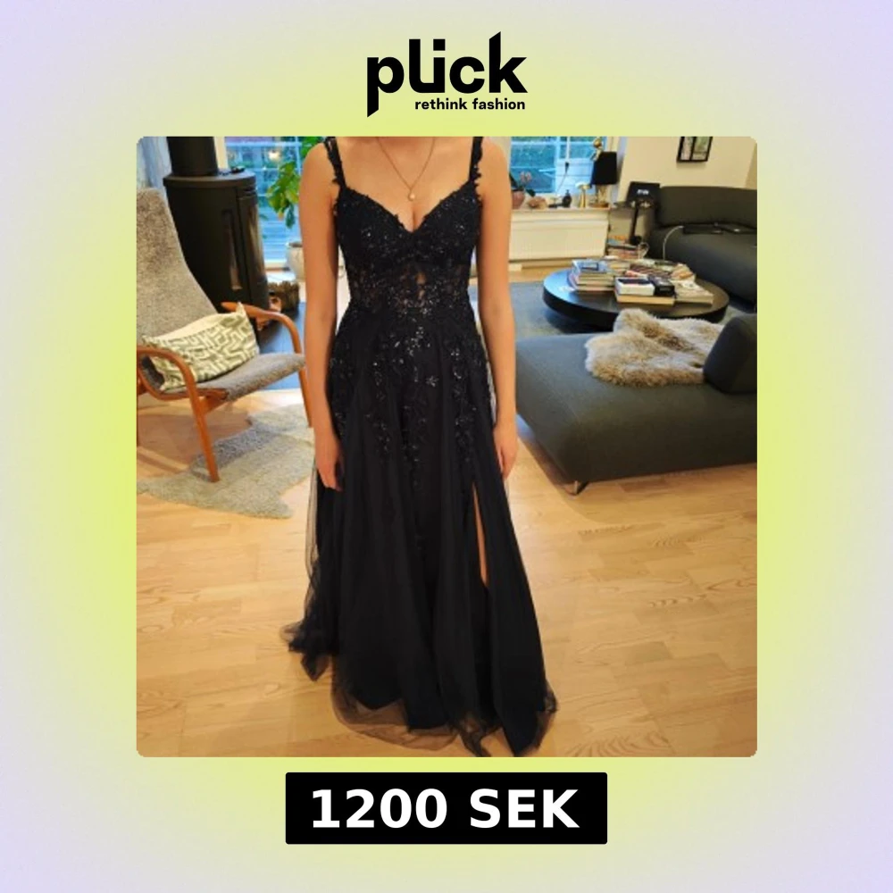 Säljer en marinblå bal med v-ringning och smala axelband. Klänningen har blommigt spetsmönster, paljettdetaljer och en slits framtill. Använd en gång och har inga defekter. Orginal pris 2100kr. Kan gå ned i pris vid snabb affär