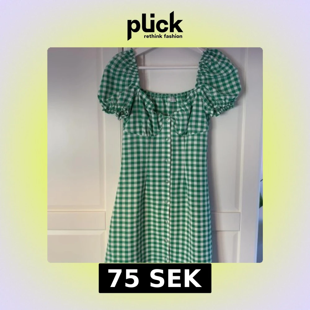 Superfin kort klänning med grönt och vitt rutigt mönster, puffärmar och knappar hela vägen framtill. Söt volang vid halsringningen och elastiska detaljer vid ärmslut.