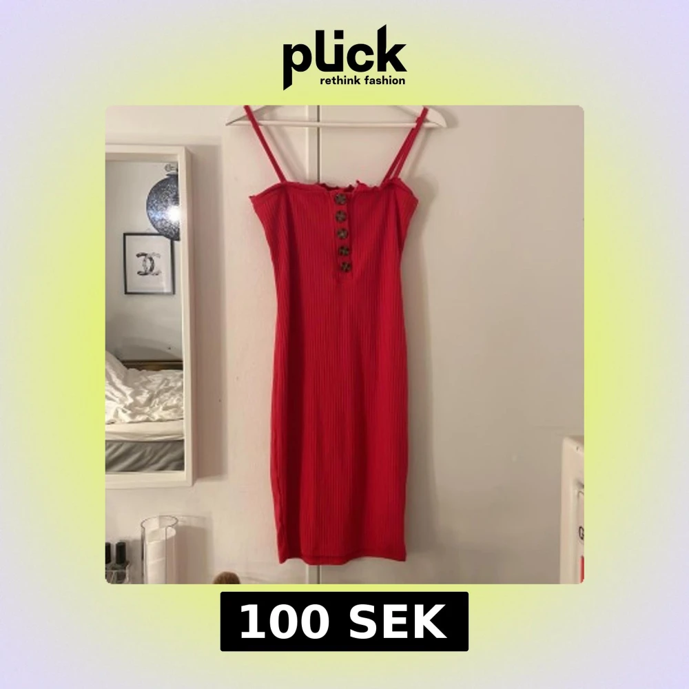 Röd ribbad klänning från Missguided med smala axelband och snygga knappar framtill. Modellen är kroppsnära och har en lätt volangkant upptill. Perfekt för dig som vill sticka ut med en färgstark look.