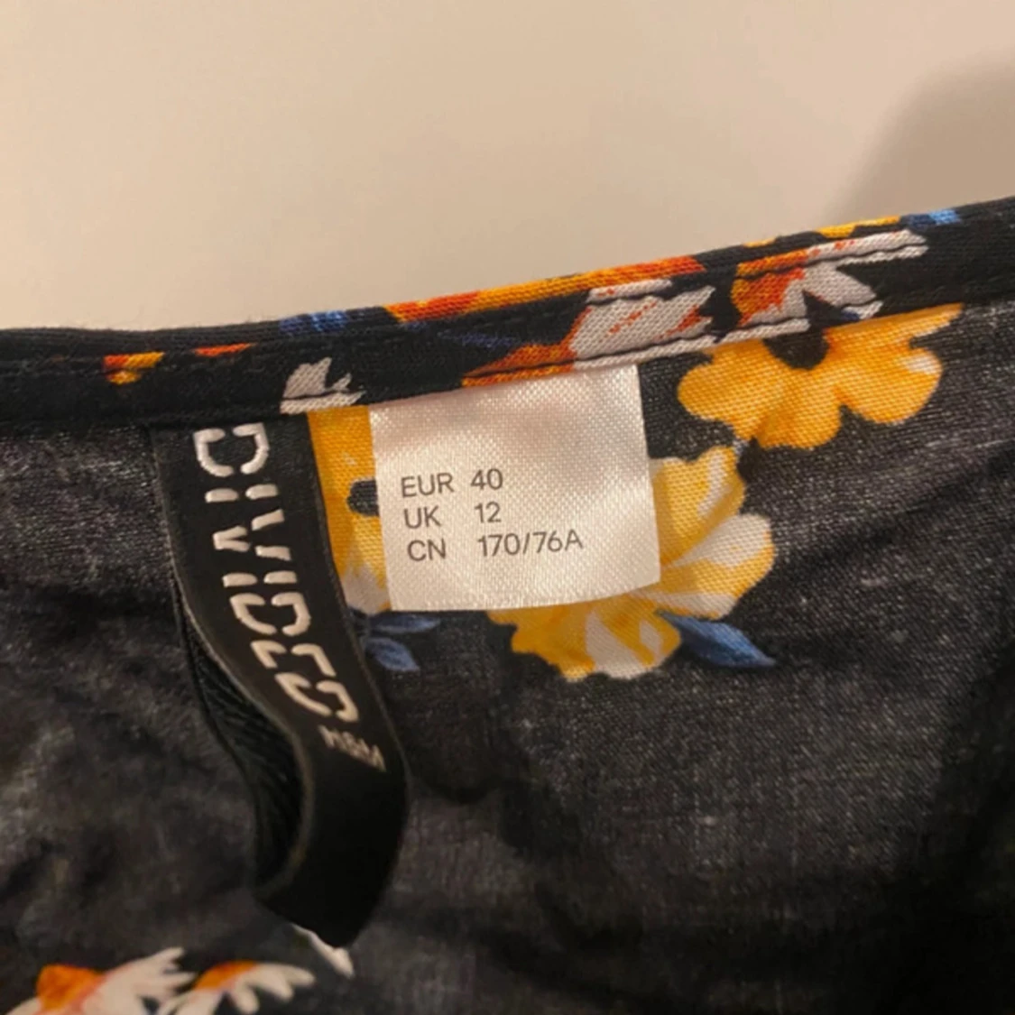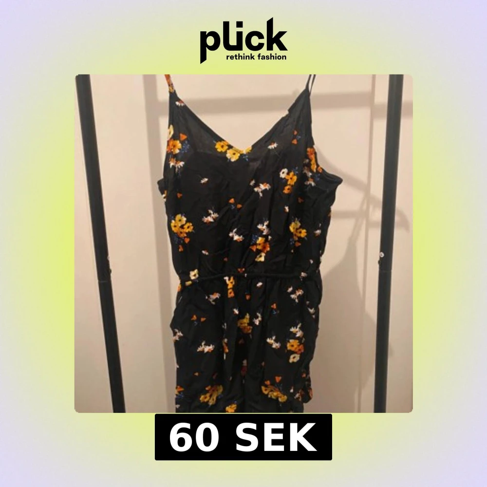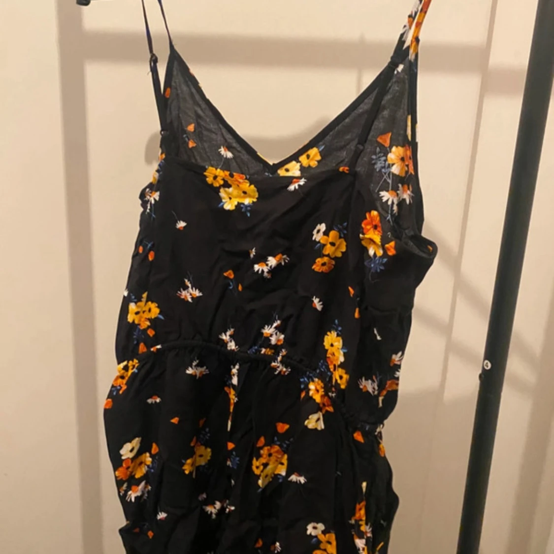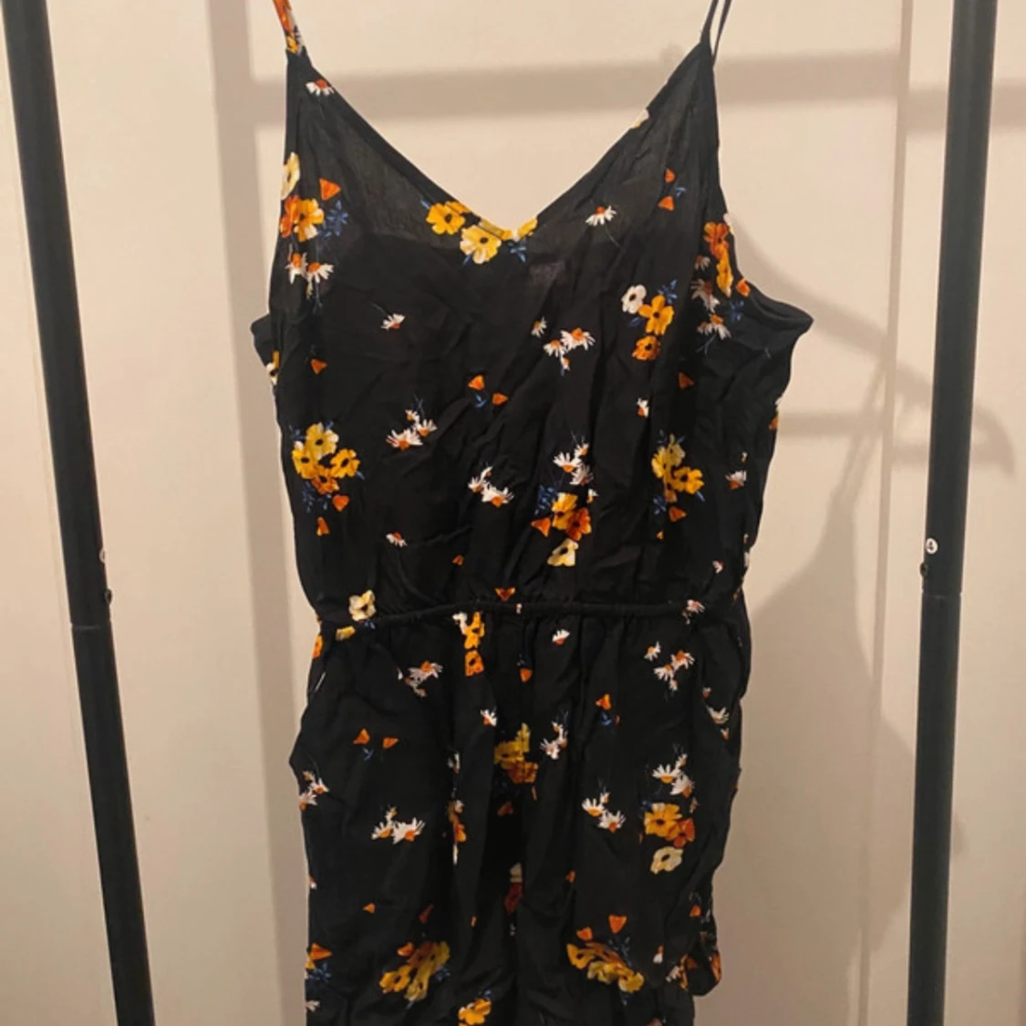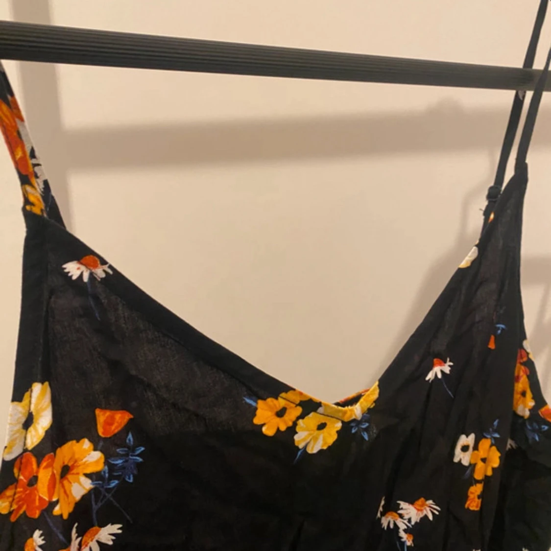 Svart jumpsuit med tunna axelband från H&M Divided, storlek 40. Klänningen har ett färgglatt blommigt mönster i gult, orange, vitt och blått. V-ringad framtill och resår i midjan för en skön passform. Perfekt för varma dagar och sommarhäng.