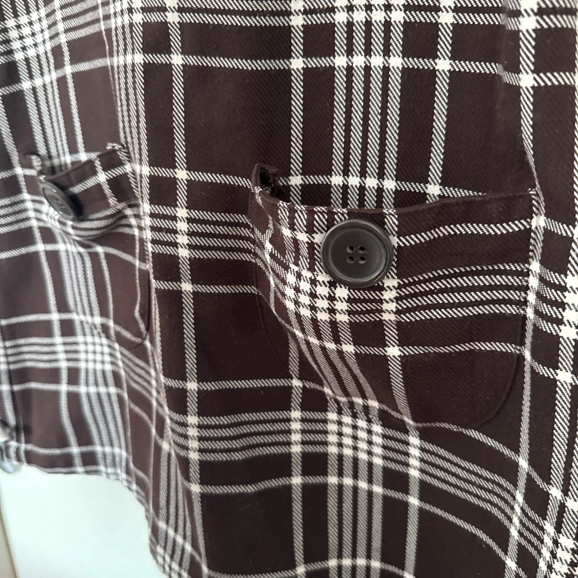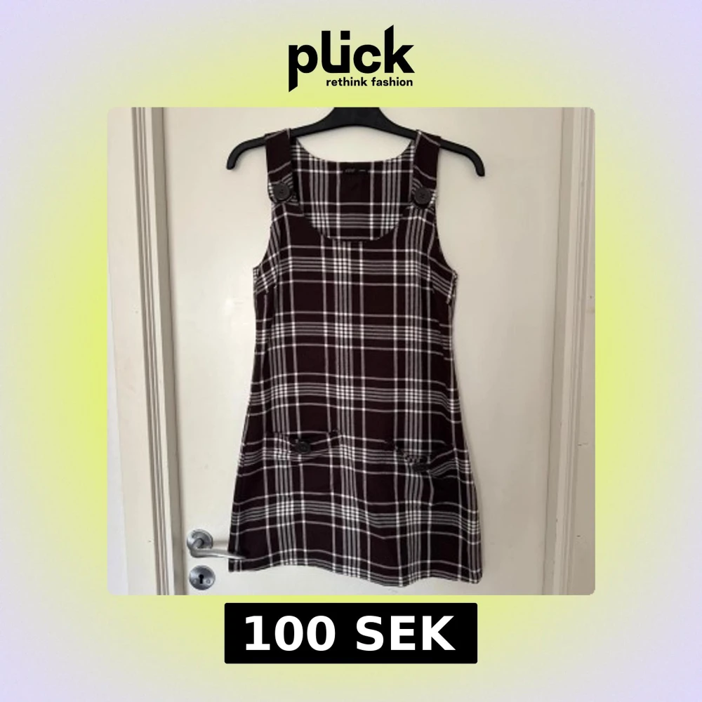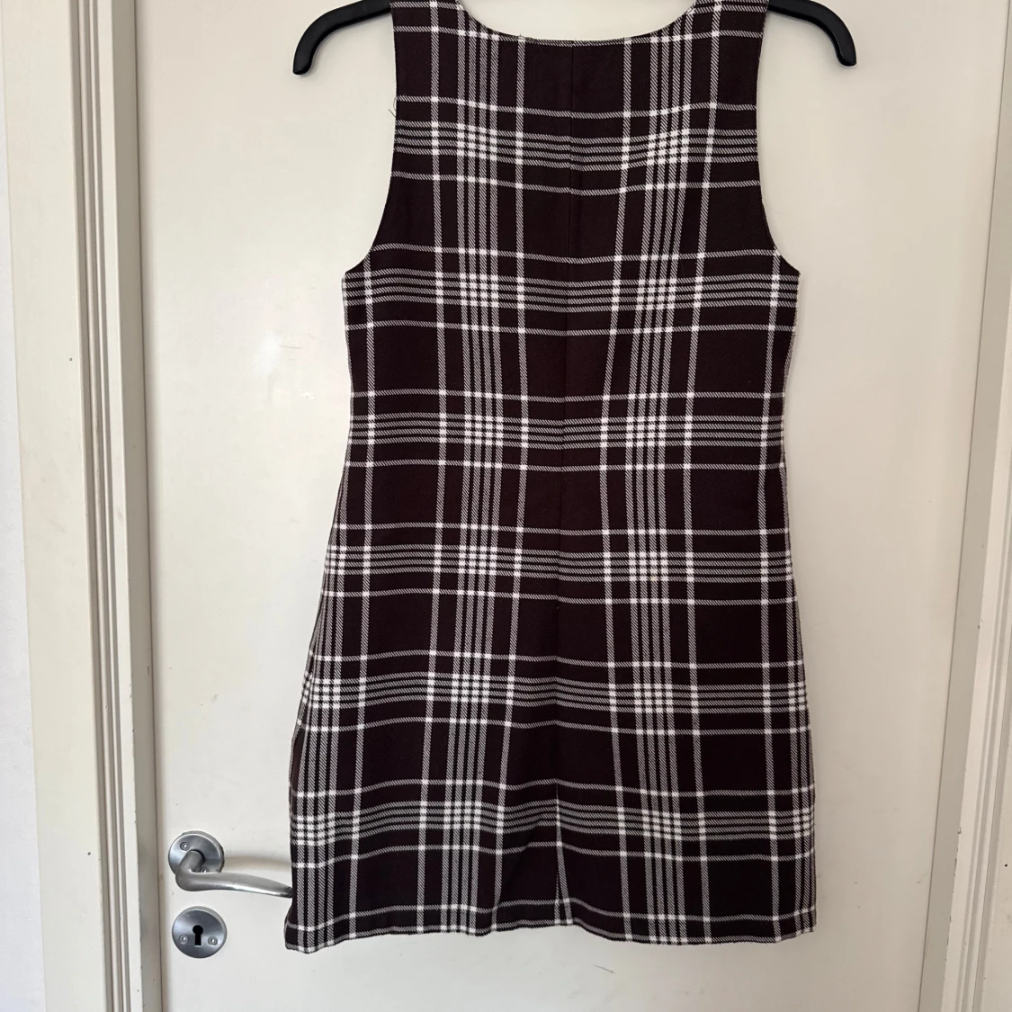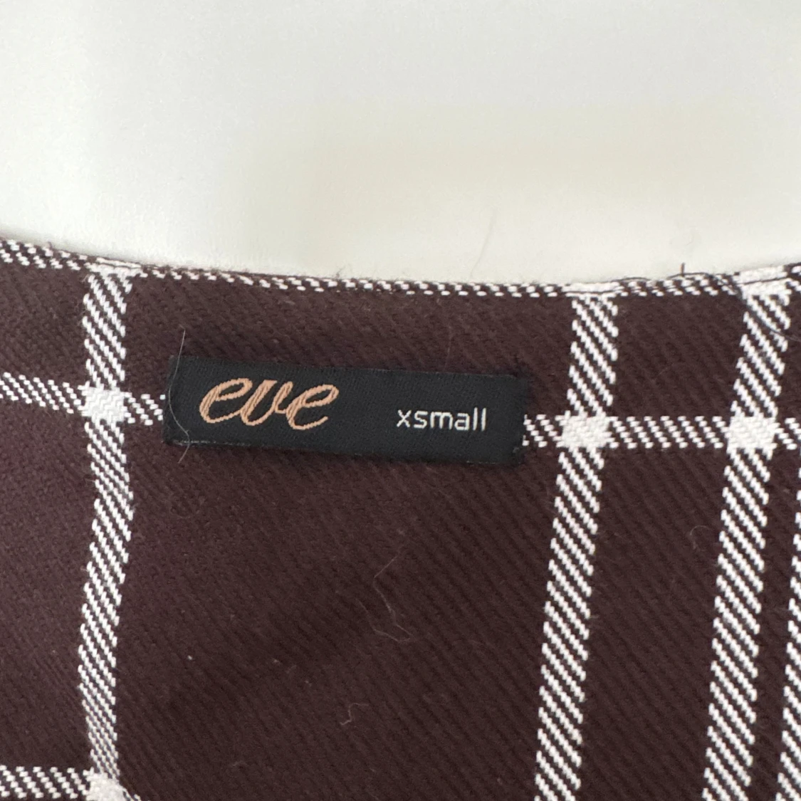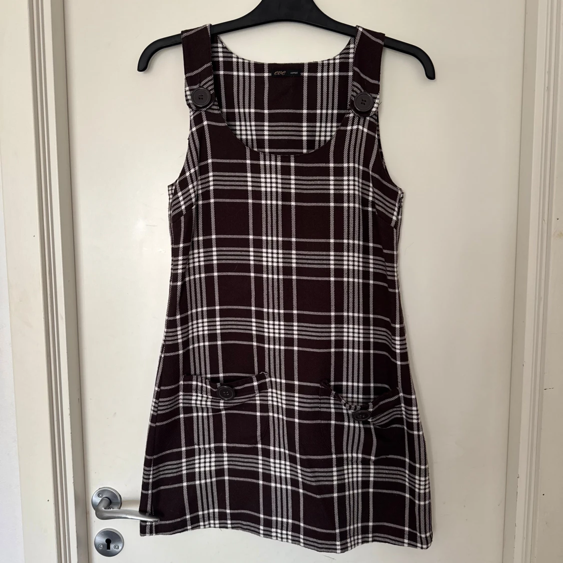 Snygg brun och vit rutig klänning från Eve i storlek XS. Klänningen har breda axelband och dekorativa knappar framtill.