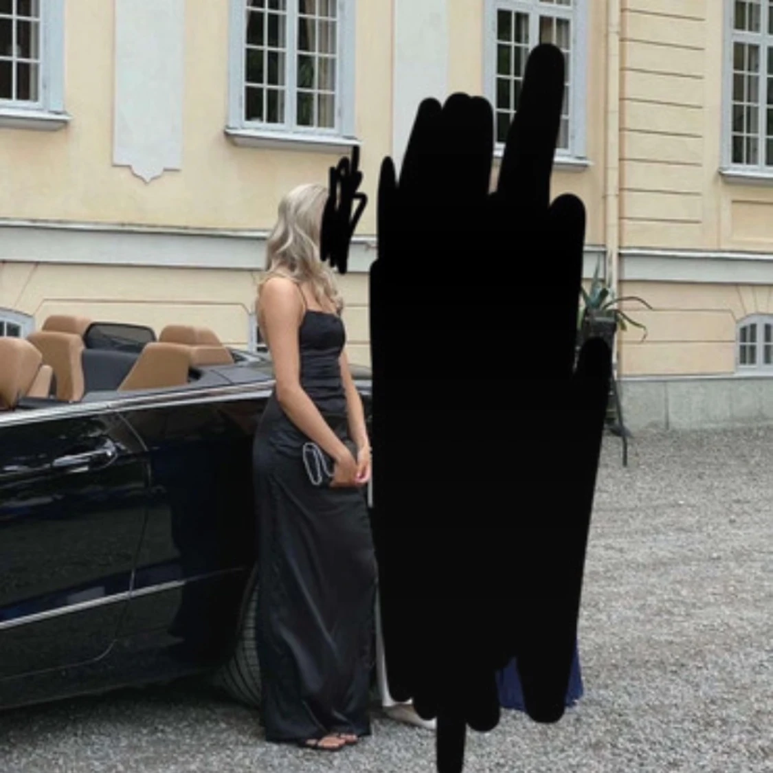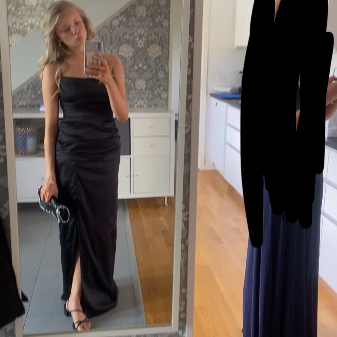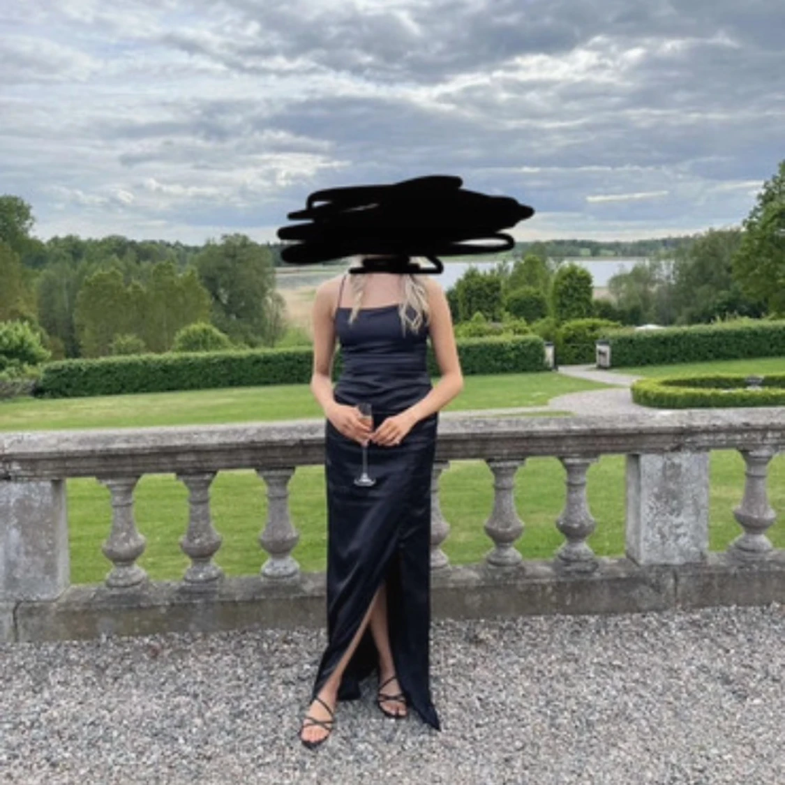 Säljer en svart långklänning med smala axelband och rak urringning. Klänningen har en snygg slits framtill och figurnära passform. Perfekt för bal eller fest, enkel men ändå elegant look. Matrialet är lite silkit och glansigt💕
