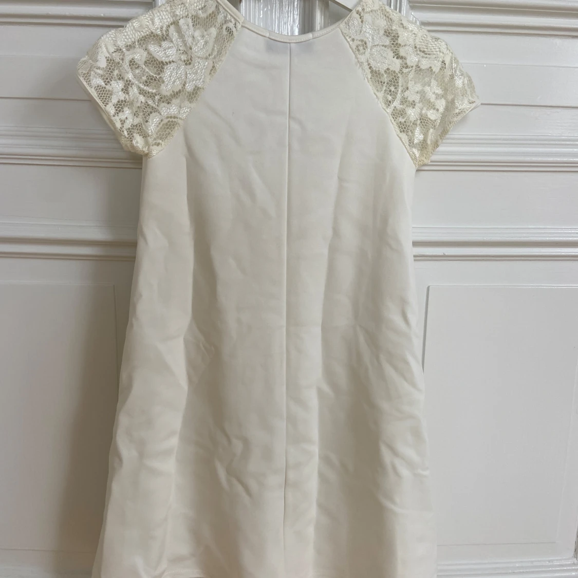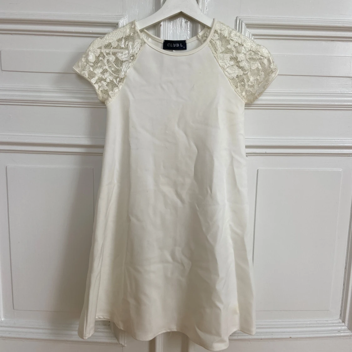 Säljer en söt vit klänning från Club L med korta ärmar i spets. Klänningen har en rak passform och är tillverkad i ett mjukt tyg som känns bekvämt. Perfekt för somriga tillfällen eller studentfirande.