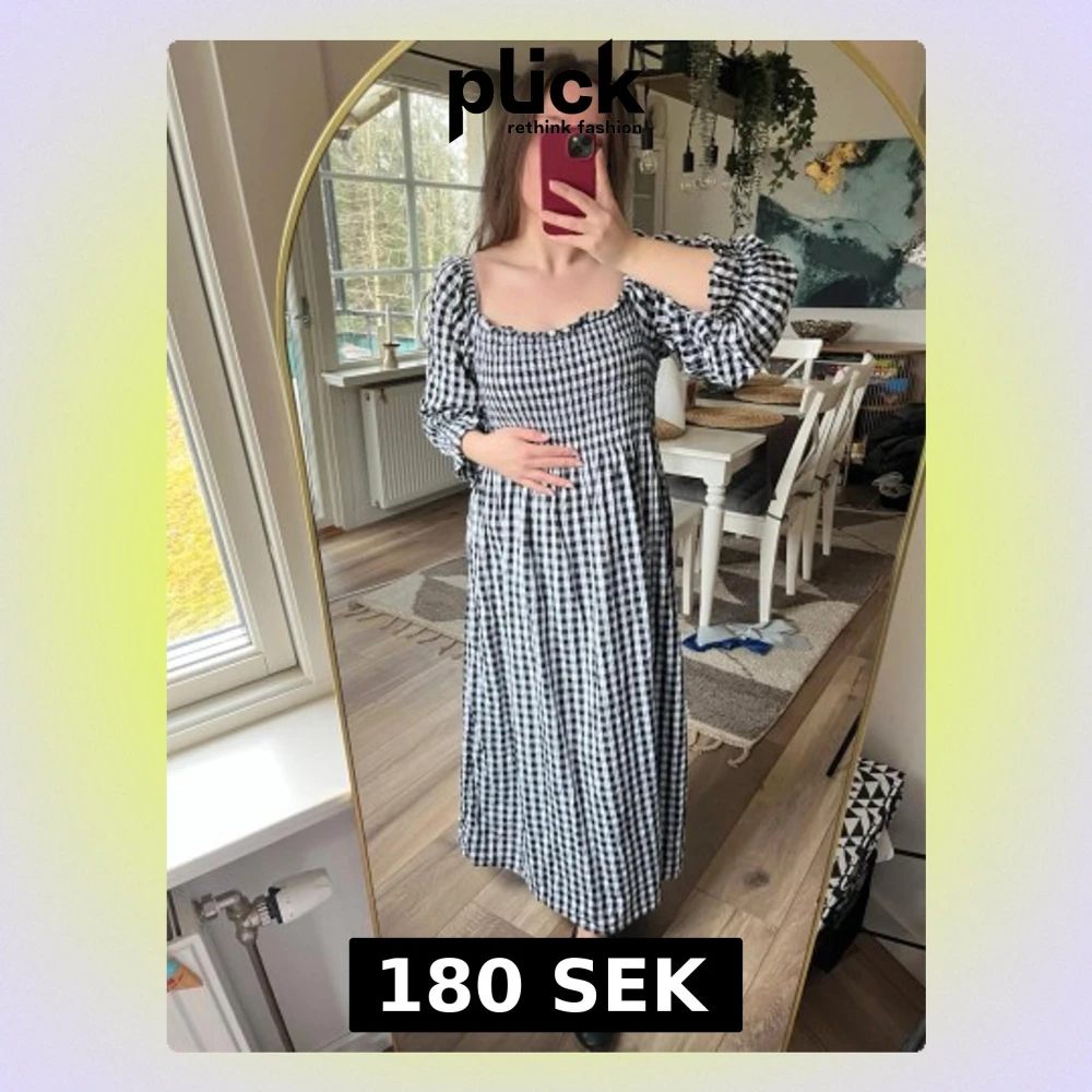 Långklänning med svartvitt rutigt mönster och puffiga långärmar. Den är lång vilket gör den passande får vår och höst, men materialet andas och är tunt så jag har även använt den på sommaren. Fin även med tjockare tröja över. Passar absolut större än stl 44 också.