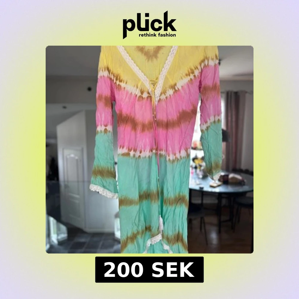 Säljer en långklänning i bohemisk stil från hot lava med batikmönster i gult, rosa och turkost. Klänningen har v-ringning med spetsdetaljer och knyt framtill. Perfekt för sommarens alla tillfällen!