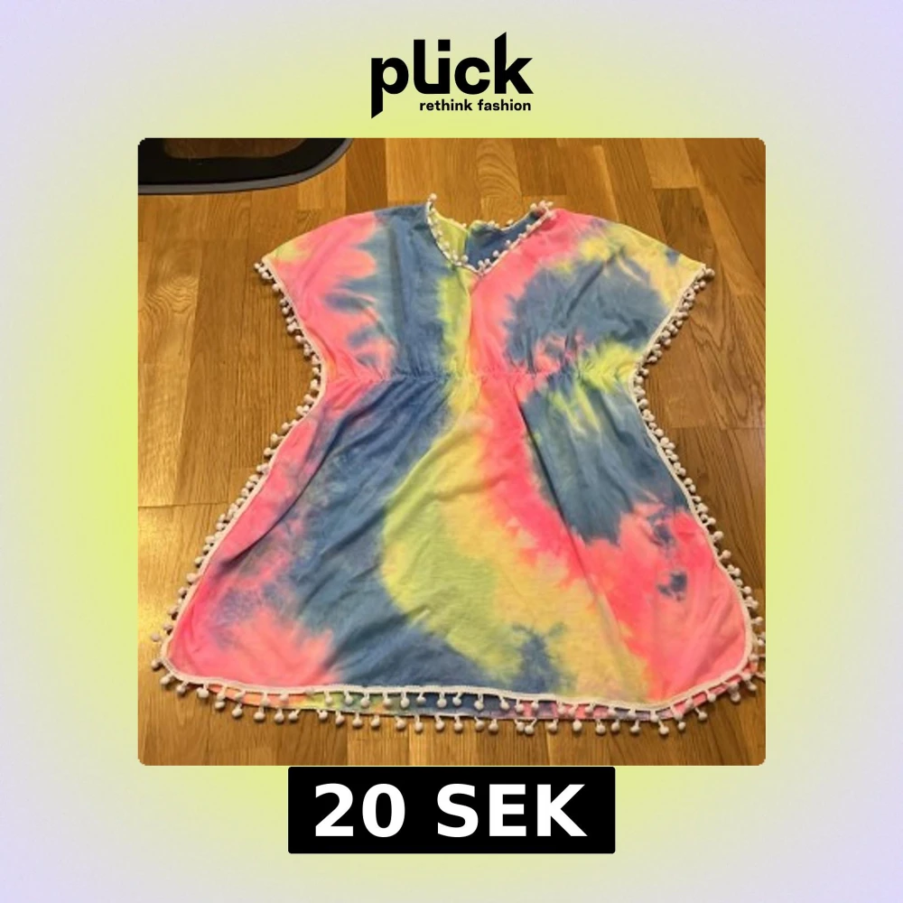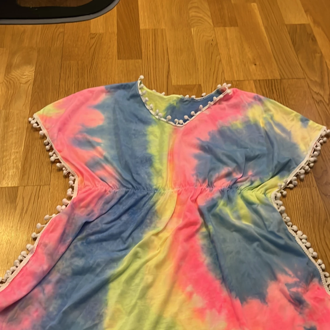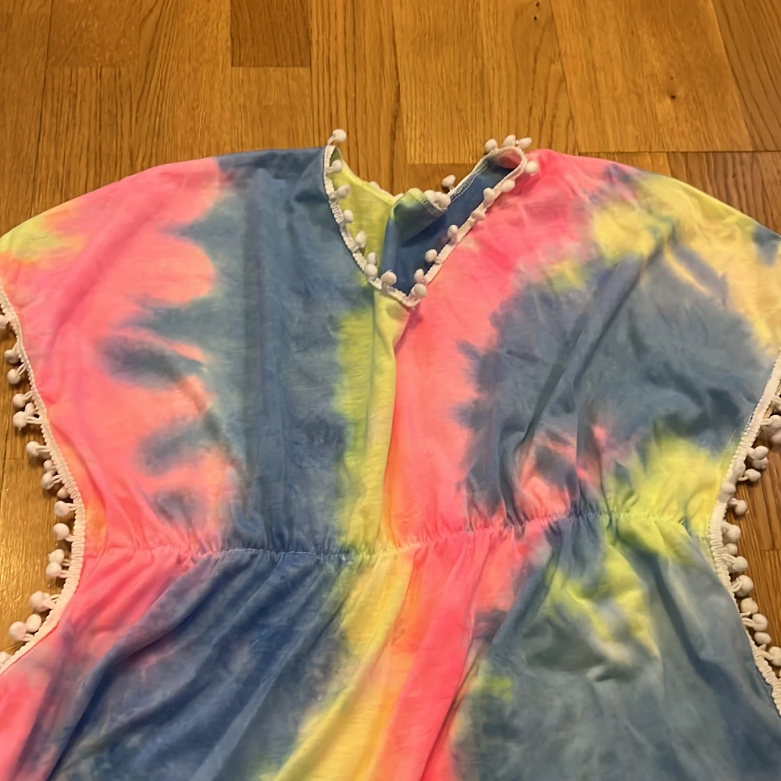 Superfin kortklänning i tie-dye med blått, rosa och gult. Klänningen har v-ringning och ärmlös design, samt vita bollar längs kanterna för en extra söt touch. Perfekt för sommarens varma dagar och strandhäng.
