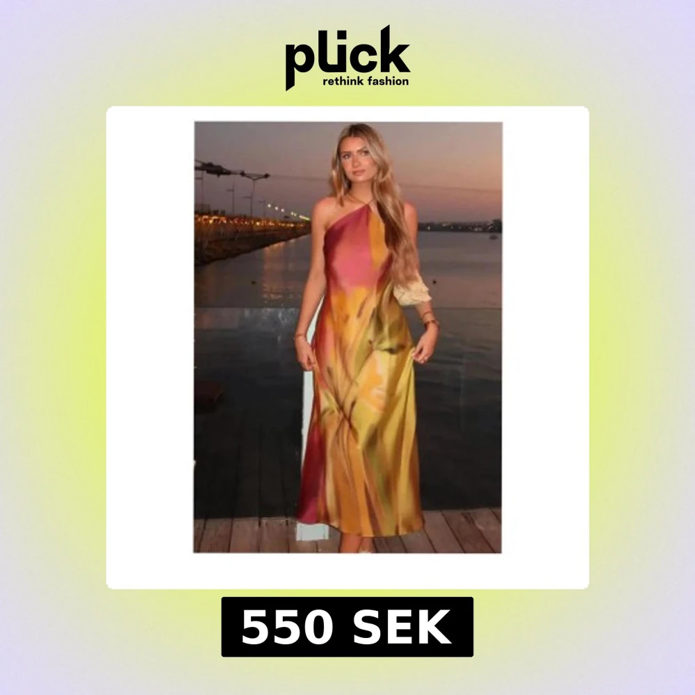 Säljer en maxiklänning med tunna axelband och blommigt mönster i gult, grönt och rött. Klänningen har en halterneck-modell och är tillverkad i ett glansigt, satininspirerat material som ger en lyxig känsla. Perfekt för sommarkvällar och när du vill sticka ut.
