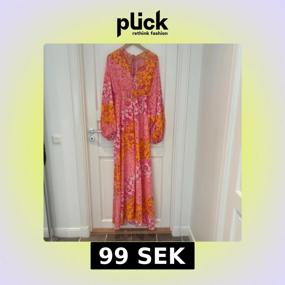 Långklänning i bohemisk stil med rosa och orange botten, täckt av röda och rosa blommor. Klänningen har långa, vida ärmar, v-ringning och snörning i ryggen. Luftigt material, perfekt för varma dagar. Snygg och unik statement-piece för dig som gillar färg.