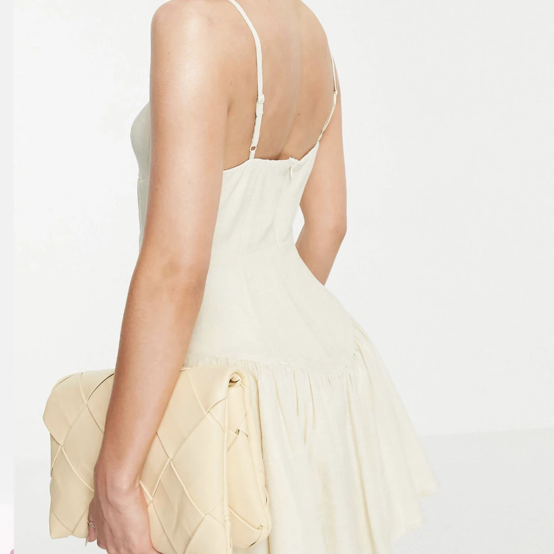 Aldrig använt. Kort klänning i gräddvit färg. En ”flowy” klänning med skönt material. Den passar inte mig då den är i storlek 38, jag bär själv 36.