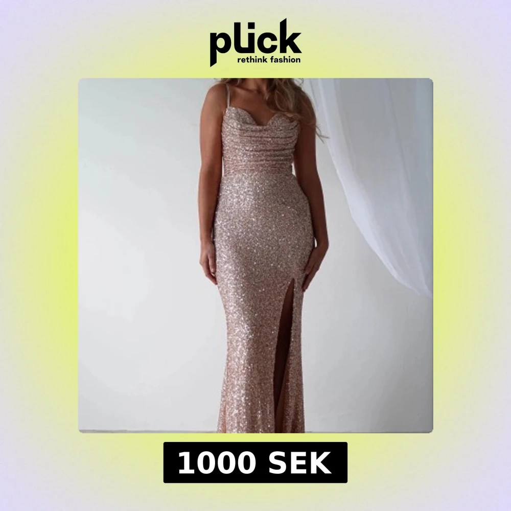 Snygg klänning i guld med tunna axelband som även går att justera, glittrigt paljettmaterial och draperad överdel. Klänningen har en figurnära passform och en hög slits framtill. Perfekt för bal eller festkvällar. Klänningen har även en ”inbyggd bh” så brösten ser bra ut i klänningen. Endast använd en gång på min bal och klänningen har inga skador förutom underkjolen på släpet som är smutsigt, då jag gick med den ute. Det är inget som syns vid användning då de andra täcker för. Org pris 1800.