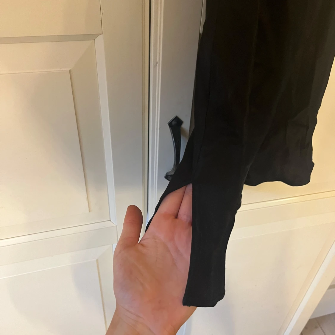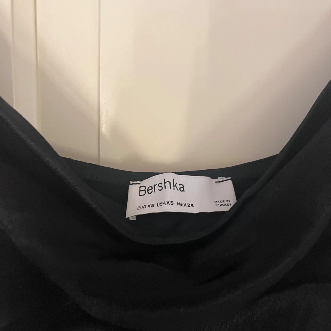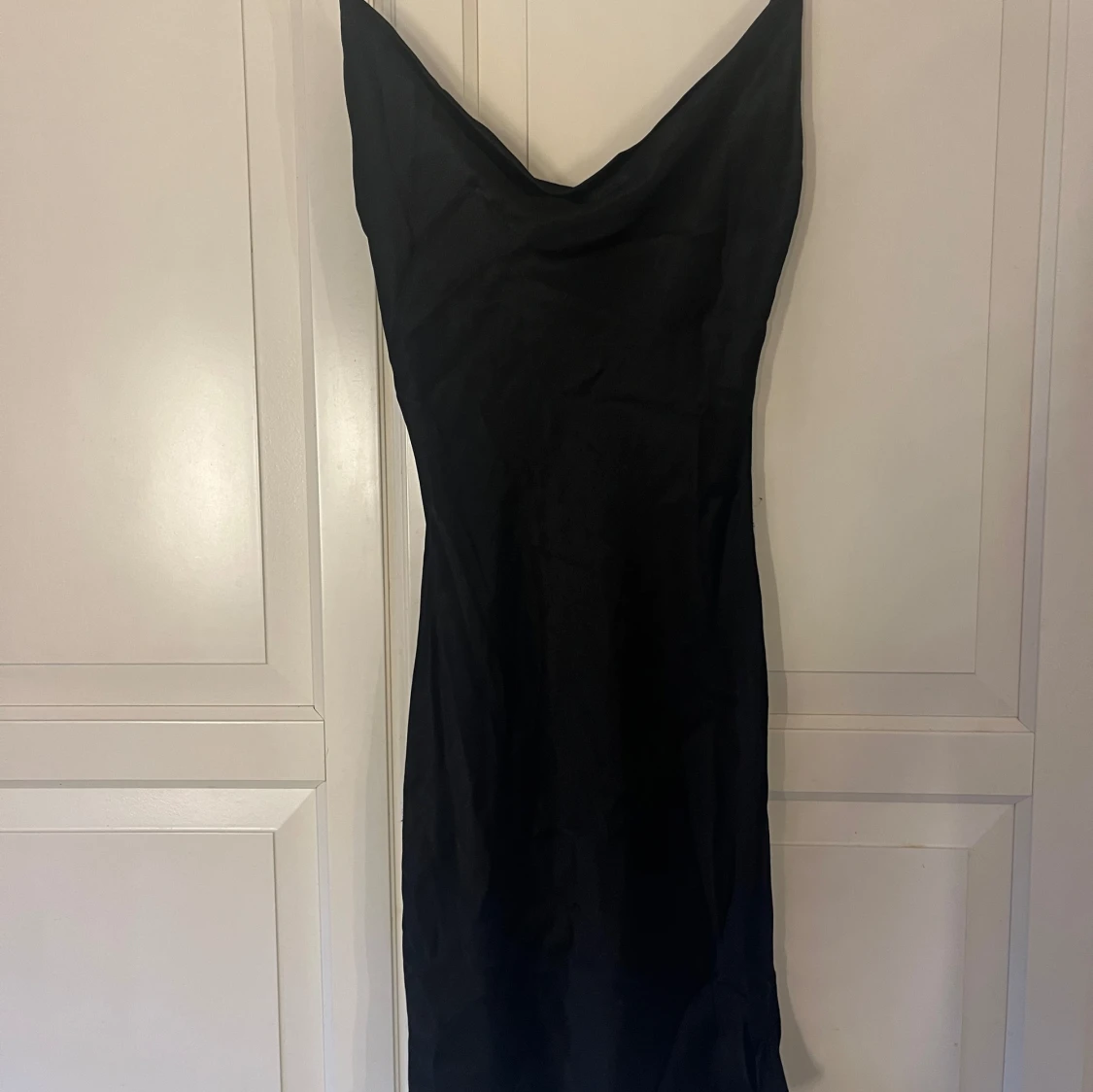 Snygg svart klänning från Bershka med smala axelband i siden material. Klänningen har en figurnära passform och sitter superfint på! Endast använd en gång! 💕