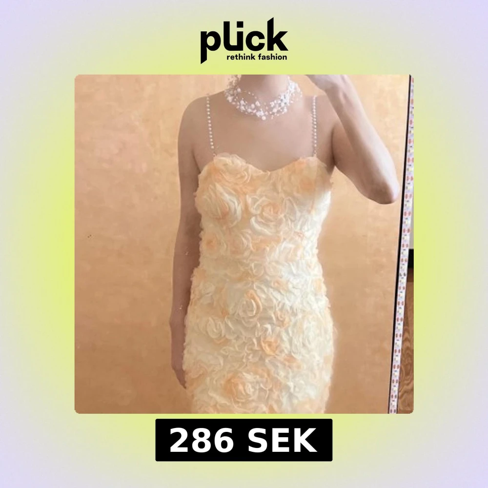 klänning i champagne och vitt med 3D-blommor över hela tyget. Klänningen har pärlband som axelband och en söt, figurnära form. Materialet är lätt och har en satinliknande insida. Dragkedja bak för enkel påklädning. Present (1 halsband i bild och 1 mask)