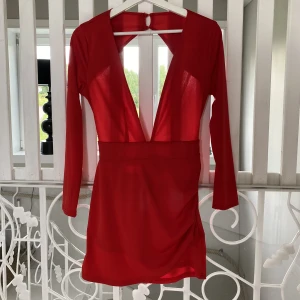 En röd festklänning med djup urringningning både fram och bak på ryggen. Lite rysch på kjolen ner till, se bild 2. Superfin och skön. Står ingen storlek med skulle säga att den är som en S eller mindre M!