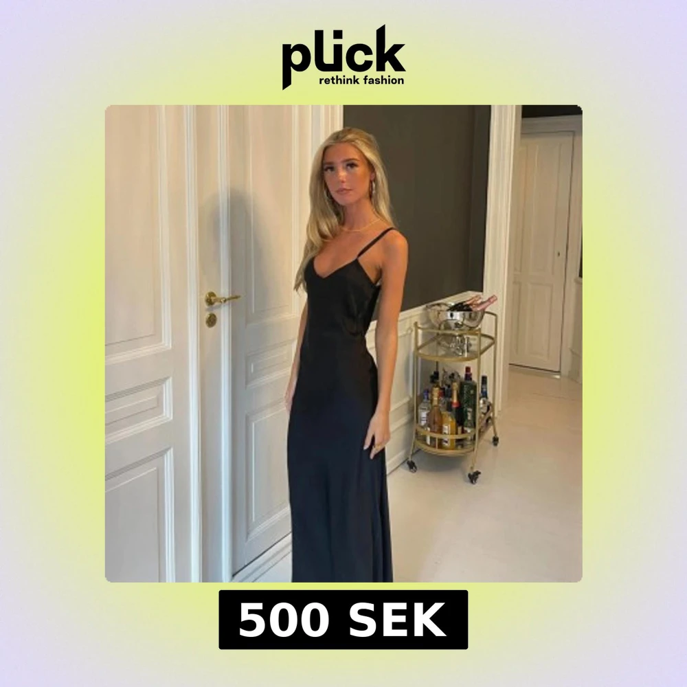 Säljer en svart långklänning i satinliknande material med smala axelband och djup v-ringning. Klänningen har en öppen rygg med snygg spetskant som ger en extra touch. Sitter snyggt och har en elegant, flowy passform.