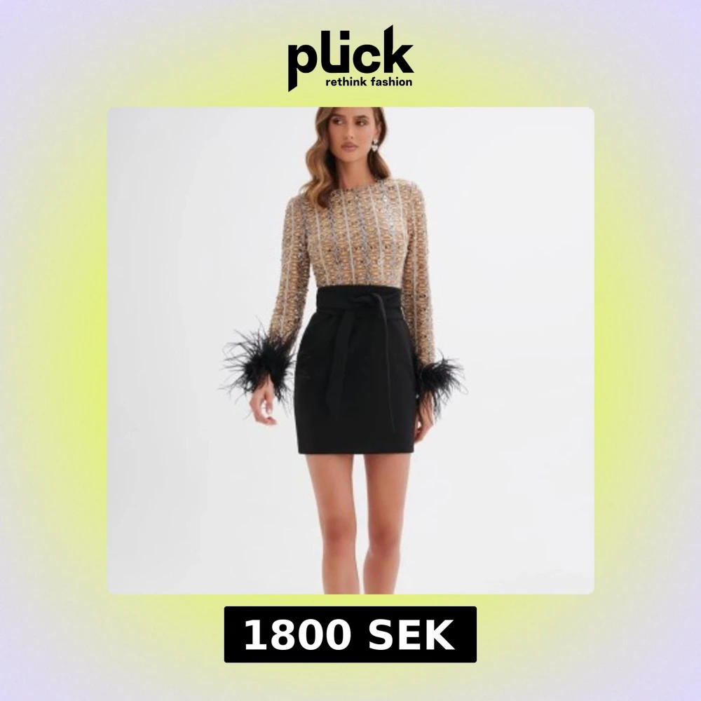 Superfin kortklänning från Lavish Alice med glittrig, rutmönstrad överdel i guld och silver, långa ärmar och svarta fjädrar vid ärmsluten. Kjolen är svart, högmidjad och har ett knytband i midjan. Nypris 4600kr🤍